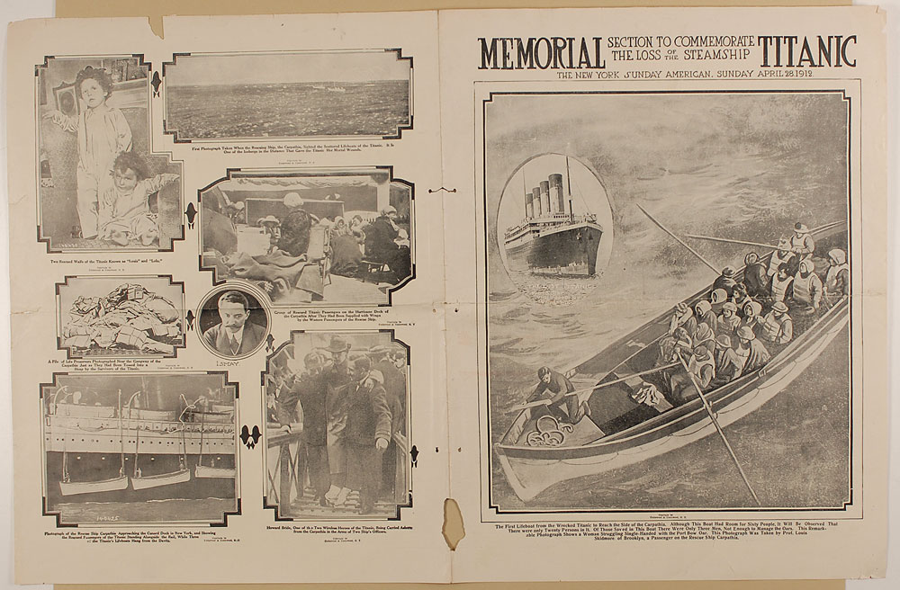 Memorial Titanic newspaper “Section to Commemorate the Loss of the Steamship” from the New York Sunday American, two pages, dated April 28, 1912, featuring an artist’s rendition of survivors rowing in “the first lifeboat to reach the side of the Carpathia,” with an oval image of “The Lost Titanic” in the top left corner. Remainder of newspaper features photos of survivors and victims, and several photos of the Carpathia. In good to very good condition, with partial separations along central horizontal fold, a couple areas of paper loss to edges, several binding holes along hinge, and a few edge tears. RR Auction COA.