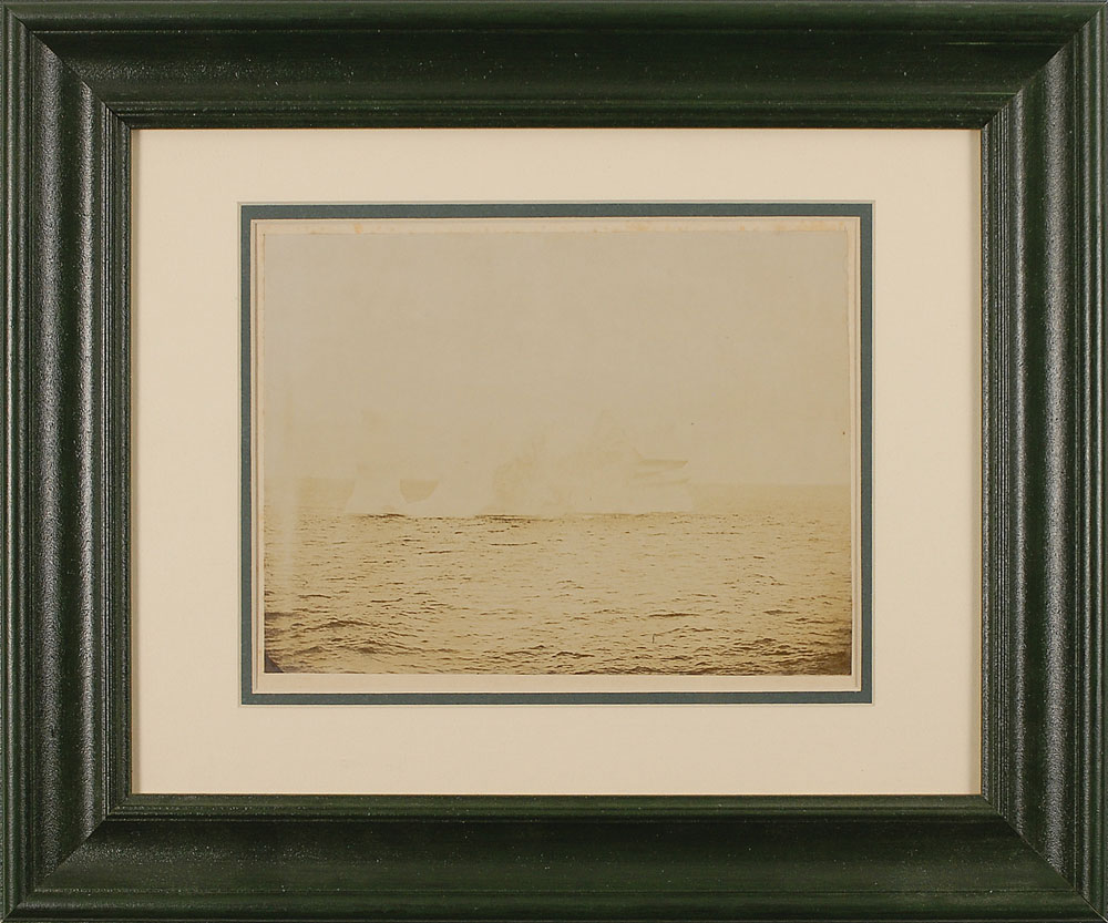 A vintage semi-glossy 9.25 x 7 photo of an iceberg, taken by a crew member of the cable ship S.S. Minia, the second ship chartered by the White Star Line to recover bodies of Titanic victims. This undated photo probably pre-dates the Titanic disaster. Double matted and framed to an overall size of 17.5 x 14.5. Some fading to upper portion of image and light silvering along bottom edge, otherwise fine condition.
