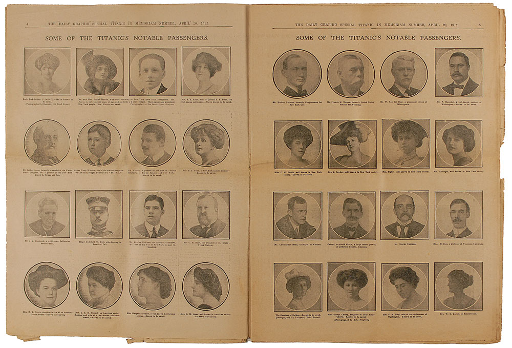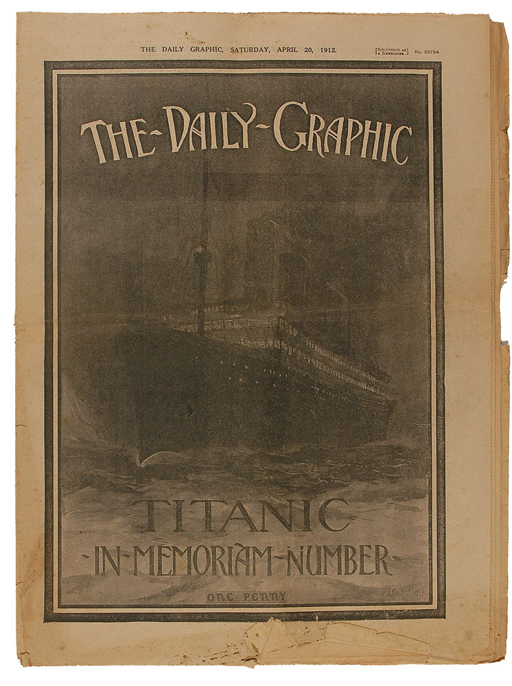 Original and complete April 20, 1912, issue of The Daily Graphic, entirely devoted as a Titanic memorial, 12.5 x 16.5, 20 pages. Front cover bears a large image of the liner, with the inside full of photos of victims and survivors, stories of the disaster, and images of the relief efforts. In good condition, with horizontal tear to final few pages, central horizontal fold, scattered edge wear and paper loss, and toning and damp staining. RR Auction COA.
