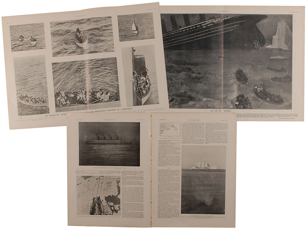Three original issues of L’Illustration, each 11.25 x 15.5, dated April 20, 27, and May 4, 1912, respectively. Each issue contains photos and articles, in French, relating to the Titanic disaster. In overall very good condition. RR Auction COA.