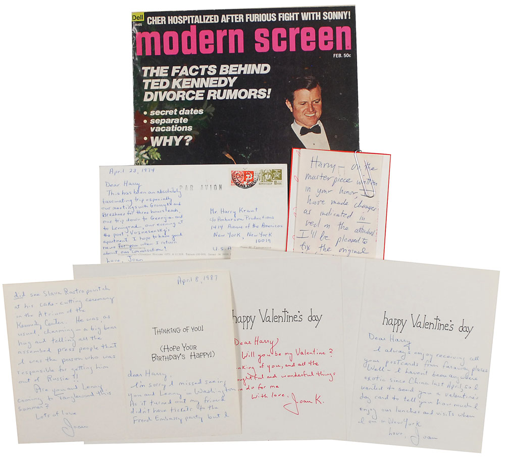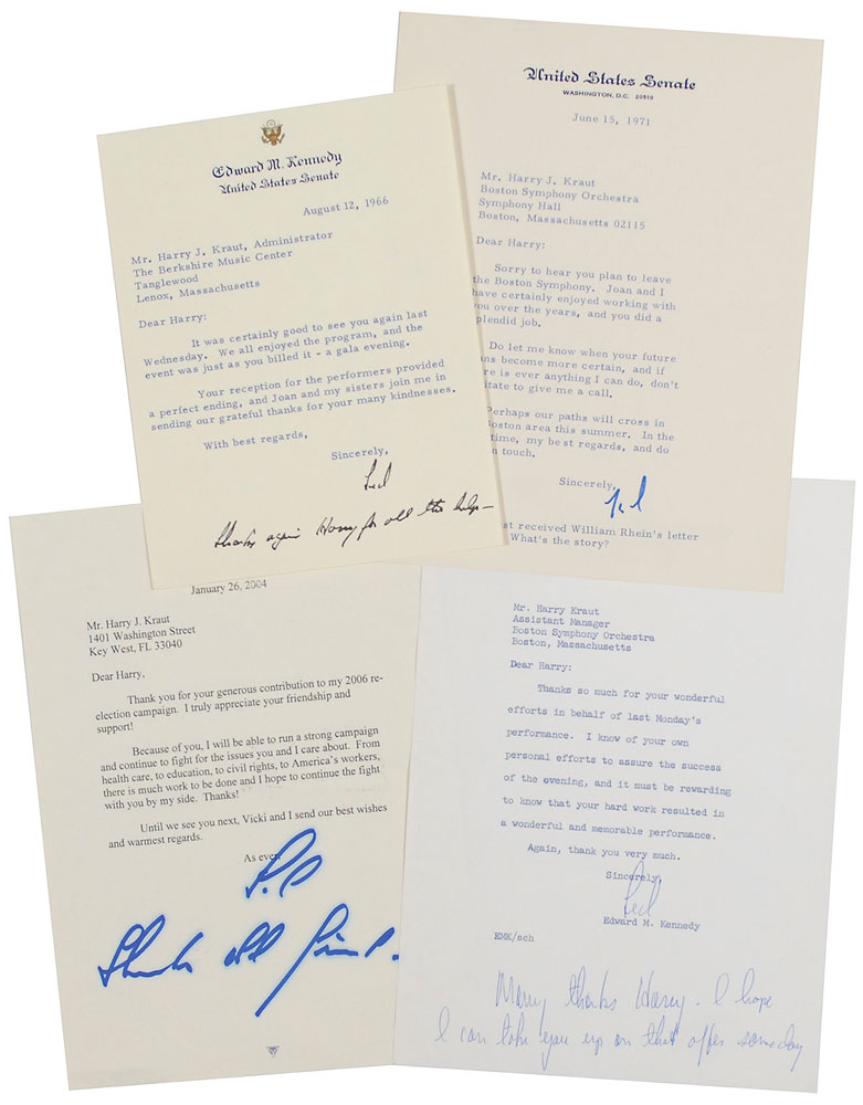 Four TLSs to assistant manager of the Boston Symphony Orchestra Harry J. Kraut, each signed “Ted,” three on US Senate letterhead (dated 1966–1971), and one on personal letterhead (dated 2004). Two letters from 1966 congratulate Kraut for excellent performances, both bearing brief autograph postscripts; one letter from 1971 relates to Kraut’s decision to leave the BSO; and the 2004 letter thanks him for a contribution to Kennedy’s 2006 reelection campaign. In 1971 Leonard Bernstein hired Kraut away from the Boston Symphony Orchestra to serve as business manager of his company, Amberson Productions. Also includes three ALSs from his first wife, Joan Bennett Kennedy, and an ANS from Marilyn Horne. In overall fine condition. Accompanied by an issue of Modern Screen magazine depicting Kennedy on the front cover. RR Auction COA.
