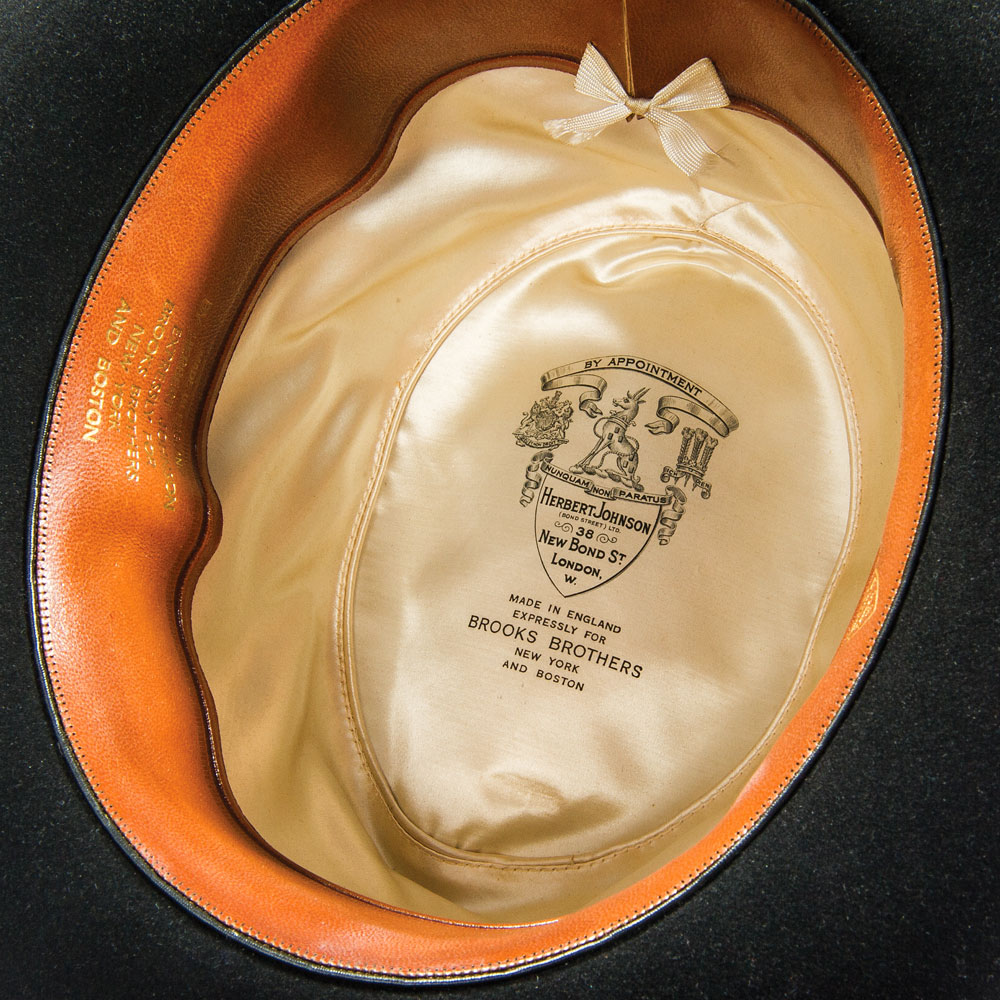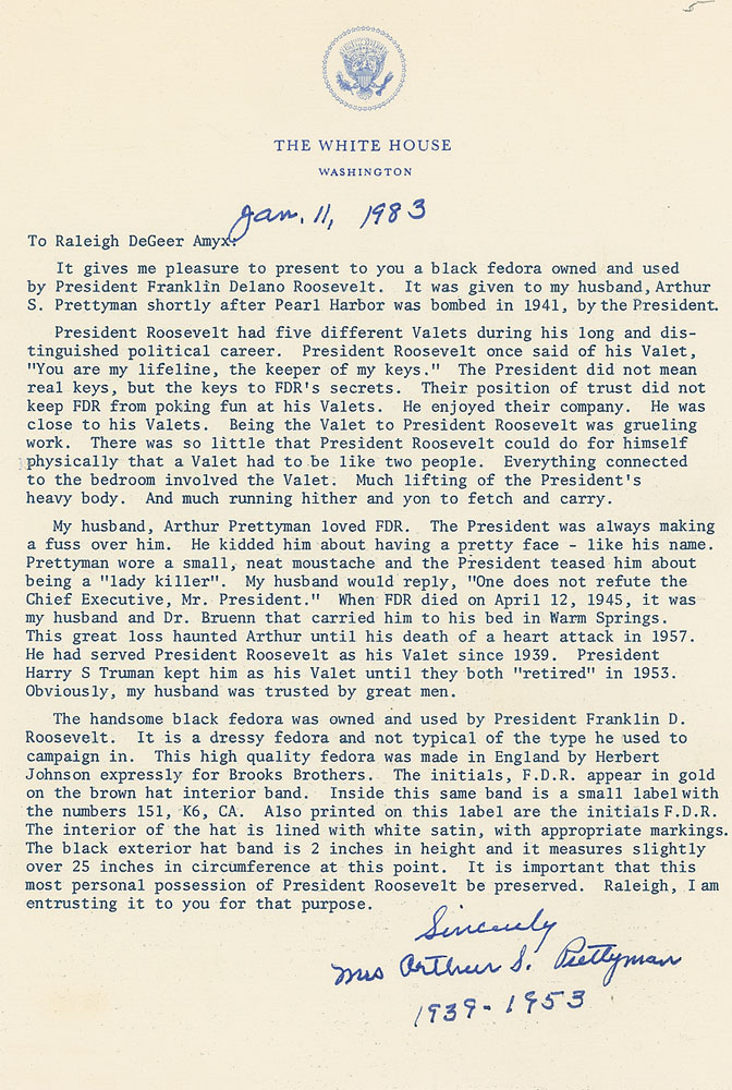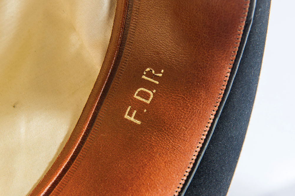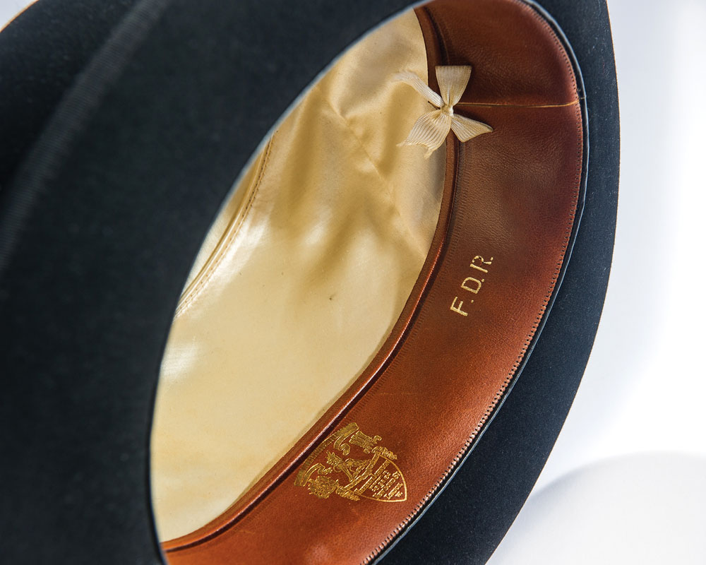 President Franklin D. Roosevelt’s personally-owned and -worn hat. Handsome black satin fedora hat, with matching band, is lined in white satin, with the liner tip labeled “Made in England expressly for Brooks Brothers, New York and Boston,” printed below a Herbert Johnson label. Brown leather sweatband is imprinted in gold, “F. D. R.,” “Made in England by Herbert Johnson expressly for Brooks Brothers New York and Boston,” and another Herbert Johnson label. A white ribbon tied in a small bow is affixed underneath where the sweatband and silk lining meet. A small reorder label is affixed inside the sweatband, with 151 K6, and CA printed on the label. Accompanied by a detailed 1983 letter of authenticity on White House letterhead, from the wife of President Roosevelt’s valet Arthur S. Prettyman. Mrs. Prettyman was also employed at the White House for a time. Letter reads, in part: “It gives me great pleasure to present to you a black fedora owned and used by President Franklin Delano Roosevelt. It was given to my husband, Arthur S. Prettyman shortly after Pearl Harbor was bombed in 1941, by the President…The handsome black fedora was owned and used by President Franklin D. Roosevelt. It is a dressy fedora and not typical of the type he used to campaign in…It is important that this most personal possession of President Roosevelt be preserved.” In fine condition. An exemplary and historic FDR offering.