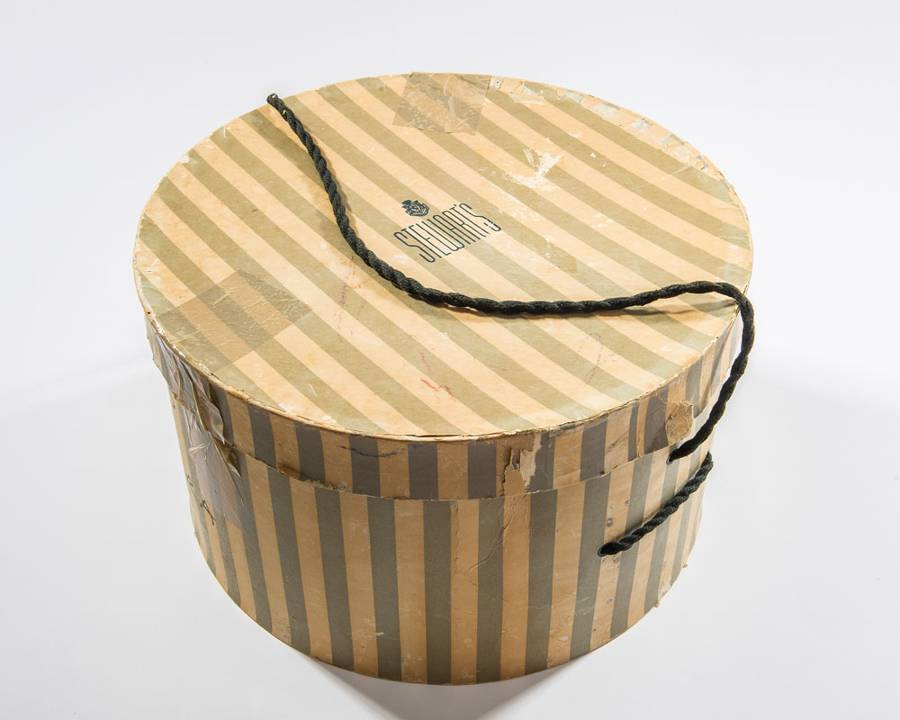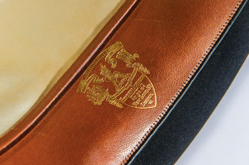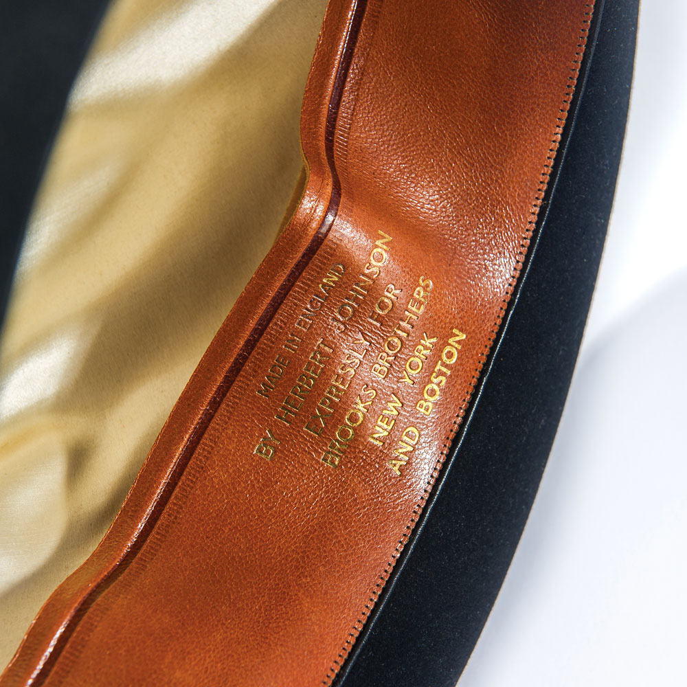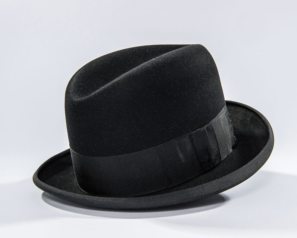 President Franklin D. Roosevelt’s personally-owned and -worn hat. Handsome black satin fedora hat, with matching band, is lined in white satin, with the liner tip labeled “Made in England expressly for Brooks Brothers, New York and Boston,” printed below a Herbert Johnson label. Brown leather sweatband is imprinted in gold, “F. D. R.,” “Made in England by Herbert Johnson expressly for Brooks Brothers New York and Boston,” and another Herbert Johnson label. A white ribbon tied in a small bow is affixed underneath where the sweatband and silk lining meet. A small reorder label is affixed inside the sweatband, with 151 K6, and CA printed on the label. Accompanied by a detailed 1983 letter of authenticity on White House letterhead, from the wife of President Roosevelt’s valet Arthur S. Prettyman. Mrs. Prettyman was also employed at the White House for a time. Letter reads, in part: “It gives me great pleasure to present to you a black fedora owned and used by President Franklin Delano Roosevelt. It was given to my husband, Arthur S. Prettyman shortly after Pearl Harbor was bombed in 1941, by the President…The handsome black fedora was owned and used by President Franklin D. Roosevelt. It is a dressy fedora and not typical of the type he used to campaign in…It is important that this most personal possession of President Roosevelt be preserved.” In fine condition. An exemplary and historic FDR offering.