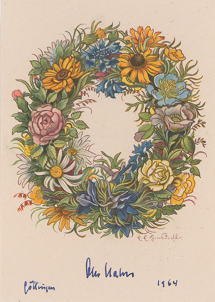 German chemist (1879–1968) who won the 1944 Nobel Prize for the discovery of nuclear fission. Postcard featuring an image of a colorful floral wreath, 4 x 5.75, signed at the bottom in fountain pen, “Otto Hahn, Gottingen 1964.” In very fine condition. RR Auction COA.