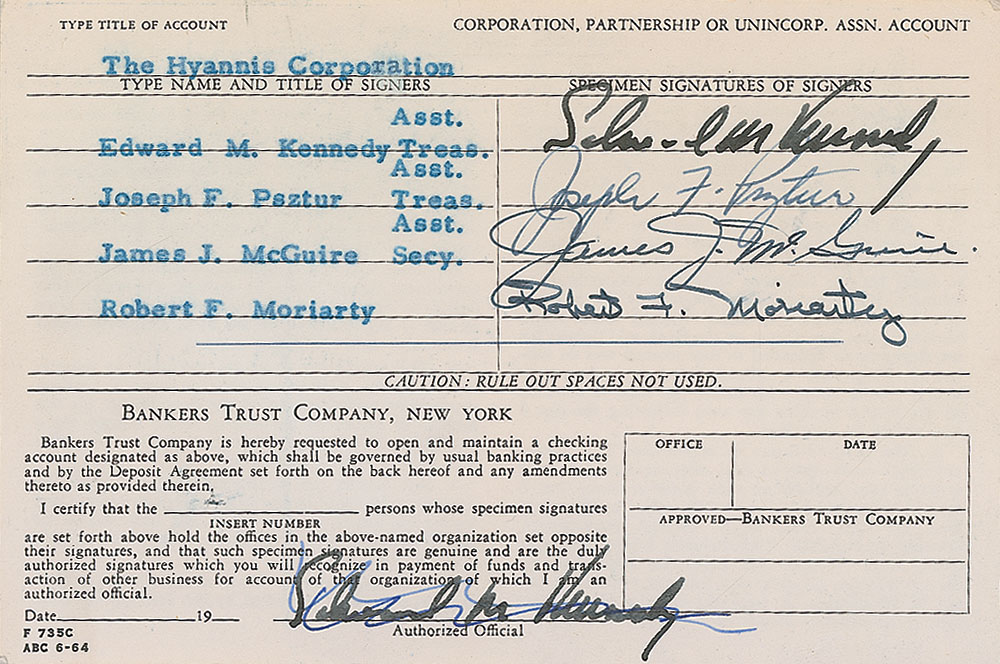 DS, signed “Edward M. Kennedy,” one page, 6 x 4, no date. Deposit agreement for an account at Bankers Trust Company, New York, for The Hyannis Corporation, signed by company officials Edward M. Kennedy, Joseph F. Psztur, James J. McGuire, and Robert F. Moriarty. Kennedy also signed at the bottom on the wrong line, which then was struck through in blue ink. In fine condition, with expected document wear. Pre-certified PSA/DNA and RR Auction COA.