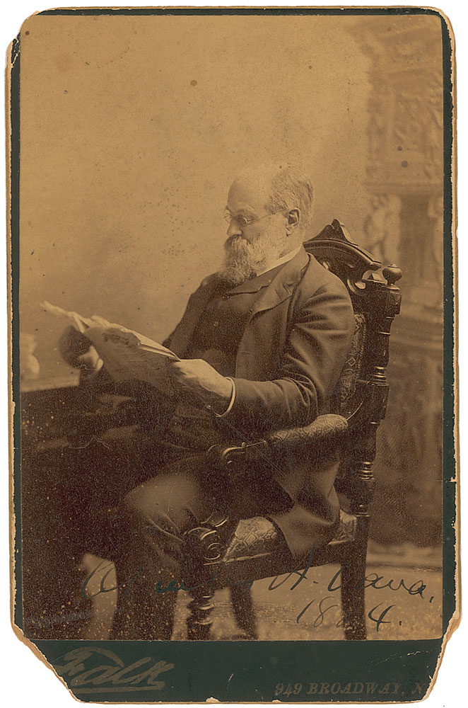 Journalist (1819–1897) best known for his support of Grant during the Civil War and his aggressive postwar political advocacy through the New York Sun newspaper. Original 4.25 x 6.5 cabinet photo of Dana casually reading a newspaper, signed at the bottom of the image in black ink, “Charles A. Dana, 1884.” Published by Falk of New York. In very good condition, with fair contrast to portions of the signature against the dark background and significant paper loss to lower corners of the mount. RR Auction COA.
