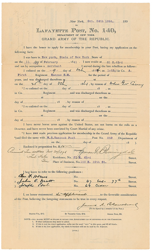 Businessman (1841–1905) who, along with his brother Joseph, founded Bloomingdale’s Department Store. Partly-printed DS, signed “Lyman G. Bloomingdale,” one page, 8.5 x 14, February 11, 1841. Bloomingdale’s application to Lafayette Post, No. 140, of the Grand Army of the Republic, listing personal information including his “occupation as a merchant,” and stating, “I served during the late rebellion as follows: I enlisted on the 9 day of Oct 1864, as 1st Sgt in Co. A First Regiment Kansas S. M.” Partial edge separations to storage folds, otherwise fine condition. Accompanied by a certificate indicating his acceptance into the GAR (separations to folds) and a 1905 letter from a chairman of the organization informing the post of his death. RR Auction COA.
