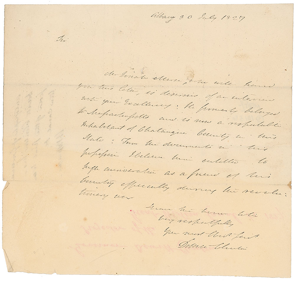 American politician (1769–1828) who served as senator and who, as governor of New York, played a major role in the construction of the Erie Canal. ALS, one page, 7.75 x 7.25, July 30, 1827. Letter of recommendation. In part: “Mr. Josiah Morse, who will hand you this letter, is desirous of an interview with your Excellency: He formerly belonged to Massachusetts and is now a respectable inhabitant of Chautauqua County in this State.” In fine condition, with intersecting folds and some show-through from docketing to reverse (a portion of which is in the hand of noted collector W. B. Sprague). Pre-certified PSA/DNA and RR Auction COA.