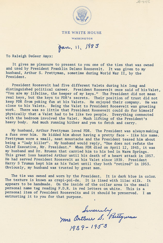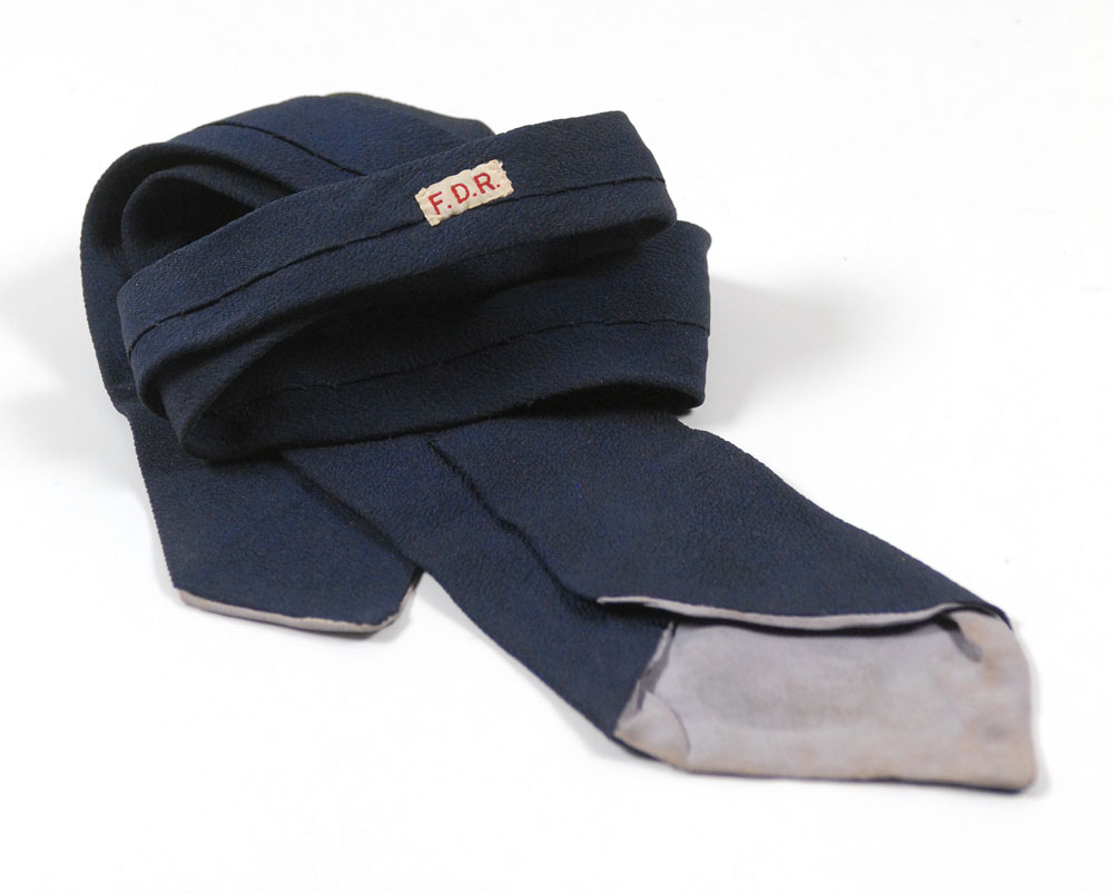 President Roosevelt’s personally-owned and -worn navy blue silk crepe neck tie, lined with lilac silk, measuring 47″ long. A small white tag is sewn inside the collar area and embroidered in red with the president’s initials, “F. D. R.” Includes a detailed letter of provenance on White House letterhead from Mildred Prettyman, a White House worker and the widow of Arthur S. Prettyman, who had served as Roosevelt’s valet from 1939 until his death in 1945, and continued to work for President Truman in the capacity of valet until he left office, in 1953. In part: “It gives me pleasure to present to you one of the ties that was owned and used by President Franklin Delano Roosevelt. It was given to my husband, Arthur S. Prettyman, sometime during World War II, by the President. President Roosevelt had five different Valets during his long and distinguished political career…Being the Valet to President Roosevelt was grueling work. There was so little that President Roosevelt could do for himself physically that a Valet had to be like two people…My husband, Arthur Prettyman loved FDR. The President was always making a fuss over him…When FDR died on April 12, 1945, it was my husband and Dr. Bruenn that carried him to his bed in Warm Springs.” A compelling piece from Roosevelt’s wardrobe, bearing his initials, in a desirable patriotic color.