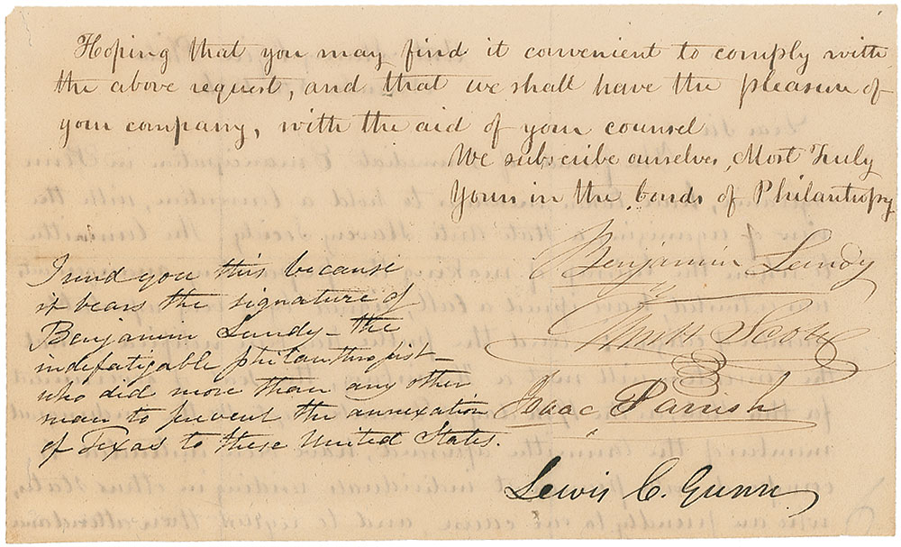 New Jersey abolitionist (1789–1839) who served as a leading critic of the Texas Revolution. LS, one page both sides, 7.75 x 4.5, November 5, 1836. Letter to an unidentified gentleman on behalf of the Anti-Slavery Office in Philadelphia. In part: “The friends of the Immediate Emancipation in Pennsylvania, have taken measures to hold a Convention, with the view of organizing a State Anti Slavery Society…We the undersigned…have been instructed to correspond with prominent individuals residing in other states, who are friendly to our cause, and to request their attendance.” Signed at the conclusion by Lundy and two other committee members. A notation at the conclusion by Lewis C. Gunn reads, “I sent this because it bears the signature of Benjamin Lundy—the indefatigable philanthropist who did more than any other man to prevent the annexation of Texas to these United States.” In fine condition, with two vertical folds, one through first letter of signature. Pre-certified PSA/DNA.
