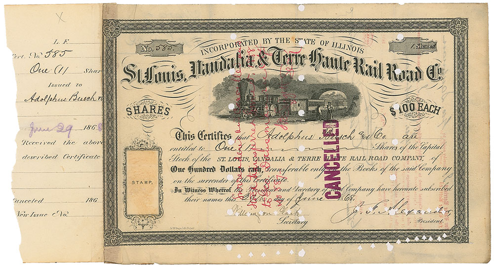 Co-founder of Anheuser-Busch (1839–1913). Rare partly-printed DS, signed “Adolphus Busch & Co.,” one page both sides, 11.25 x 7.25, June 29, 1868. Certificate for one share of stock in the St. Louis, Vandalia, and Terre Haute Rail Road Company issued to “Adolphus Busch and Co.,” signed on the reverse by Busch transferring the stock to George Dausmause. A portion of the receipt is affixed to the left edge of the certificate. In very good condition, with intersecting folds, one through a single letter of signature, machine cancellations, a cancelled stamp and ink notation to front, and some scattered light toning. Uncommon in any form, this is the first Busch autograph we have ever offered. RR Auction COA.