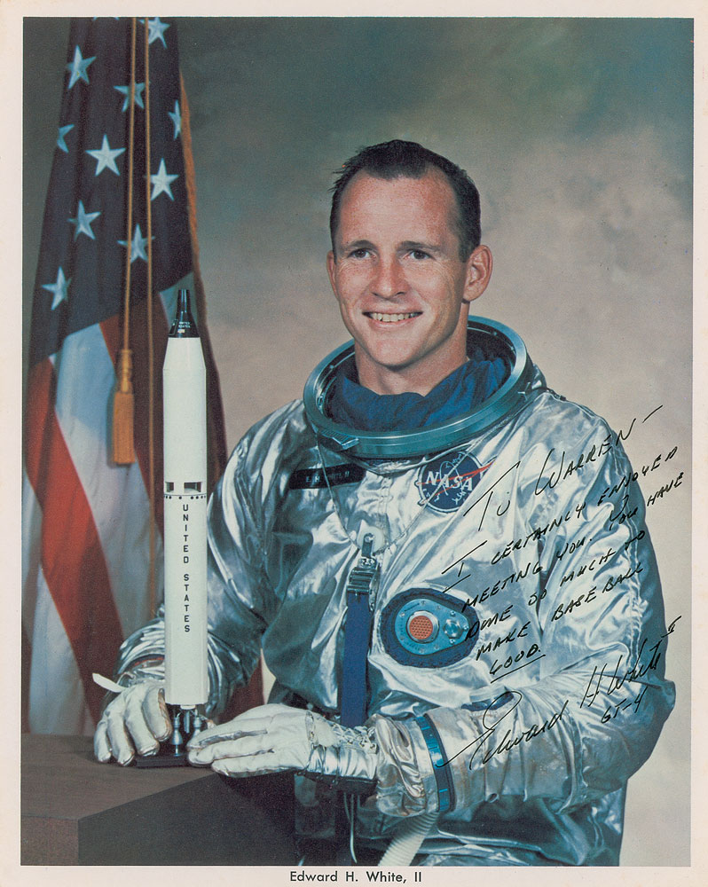 Official color 8 x 10 NASA lithograph, signed and inscribed in black ink to baseball Hall of Famer Warren Spahn, “To Warren—I certainly enjoyed meeting you. You have done so much to make baseball good. Edward H. White II, GT-4.” In fine condition. Photo originates from the personal collection of Hall of Fame pitcher Warren Spahn, and is accompanied by a letter of provenance from Spahn’s son. Pre-certified Steve Zarelli and RR Auction COA.