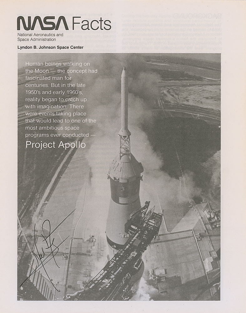 NASA facts booklet on Project Apollo, 8.5 x 11, eight pages, featuring a summary of the Apollo missions, as well as photos of each crew. Signed on the front cover in black felt tip by Armstrong. In fine condition. Pre-certified Steve Zarelli and RR Auction COA.