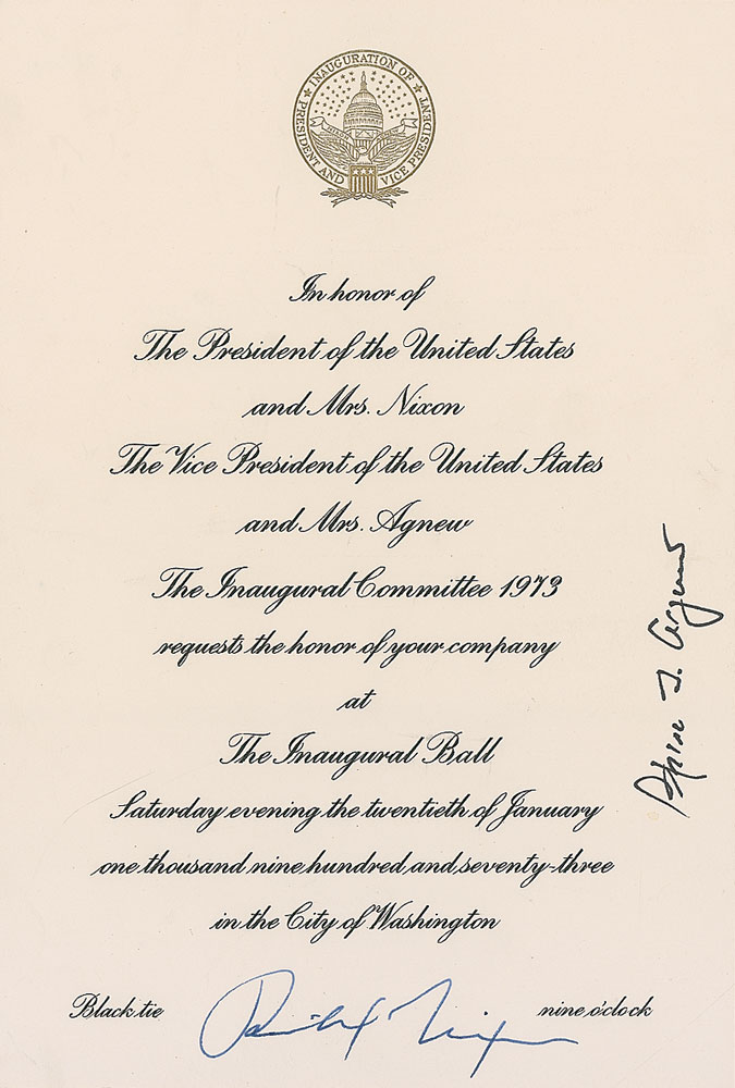 Engraved invitation to the 1973 Inaugural Ball, 5.25 x 7.5, signed along the bottom in blue ink by Nixon and along the right edge vertically in black ink by Spiro Agnew. In very fine condition. Pre-certified PSA/DNA and RR Auction COA.