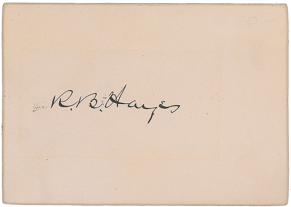Crisp ink signature, “R. B. Hayes,” on an off-white 3.75 x 2.5 card. In fine condition, with a very mild block of toning over signature from previous display. Pre-certified John Reznikoff/PSA/DNA and RR Auction COA.