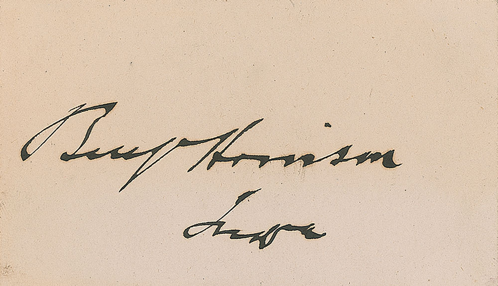 Bold ink signature, “Benj. Harrison, Indiana,” on an off-white 3.25 x 2 card. In fine condition, with a couple of trivial mounting remnants to reverse. Pre-certified John Reznikoff/PSA/DNA and RR Auction COA.