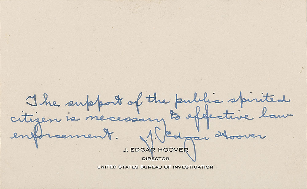 AQS on an off-white 5.25 x 3.25 embossed FBI card. Hoover writes, “The support of the public spirited citizen is necessary to effective law enforcement,” and signs at the conclusion. In fine condition. Pre-certified PSA/DNA and RR Auction COA.
