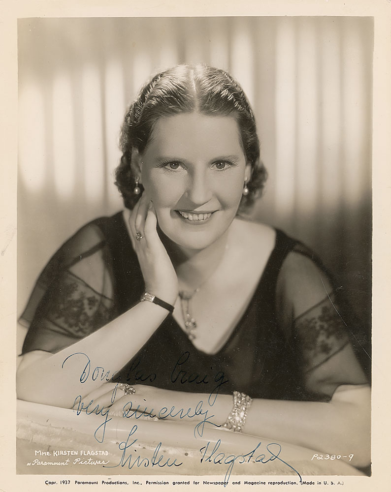 Highly regarded Norwegian soprano (1895–1962) regarded by many as ‘the voice of the century.’ Vintage glossy 8 x 10 Paramount Pictures publicity photo, signed and inscribed in fountain pen, “Douglas Craig, very sincerely, Kirsten Flagstad.” In very good condition, with scattered creases and some light contrast and irregular ink adhesion to inscription. RR Auction COA.