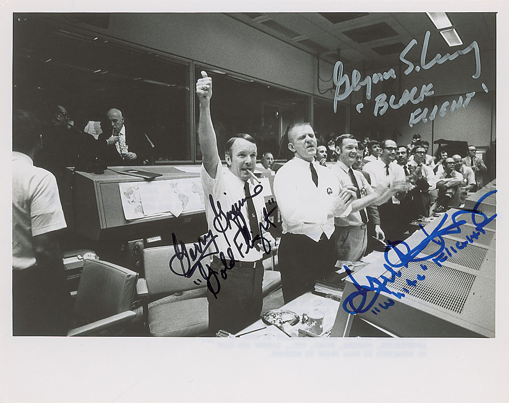 Official 10 x 8 NASA glossy photo of mission control celebrating the successful conclusion of the Apollo 13 mission, signed in ink and felt tip by Gene Kranz, Gerry Griffin, and Glynn Lunney, each adding their assignments under their signatures. In fine condition. Pre-certified Steve Zarelli and RR Auction COA.
