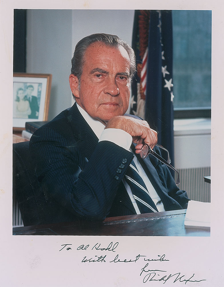 Color satin-finish 8.5 x 11 photo, signed and inscribed in the lower border in black ink, “To Al Kohl, with best wishes from Richard Nixon.” A few diagonal bends and creases, otherwise fine condition. Pre-certified John Reznikoff/PSA/DNA and RR Auction COA.