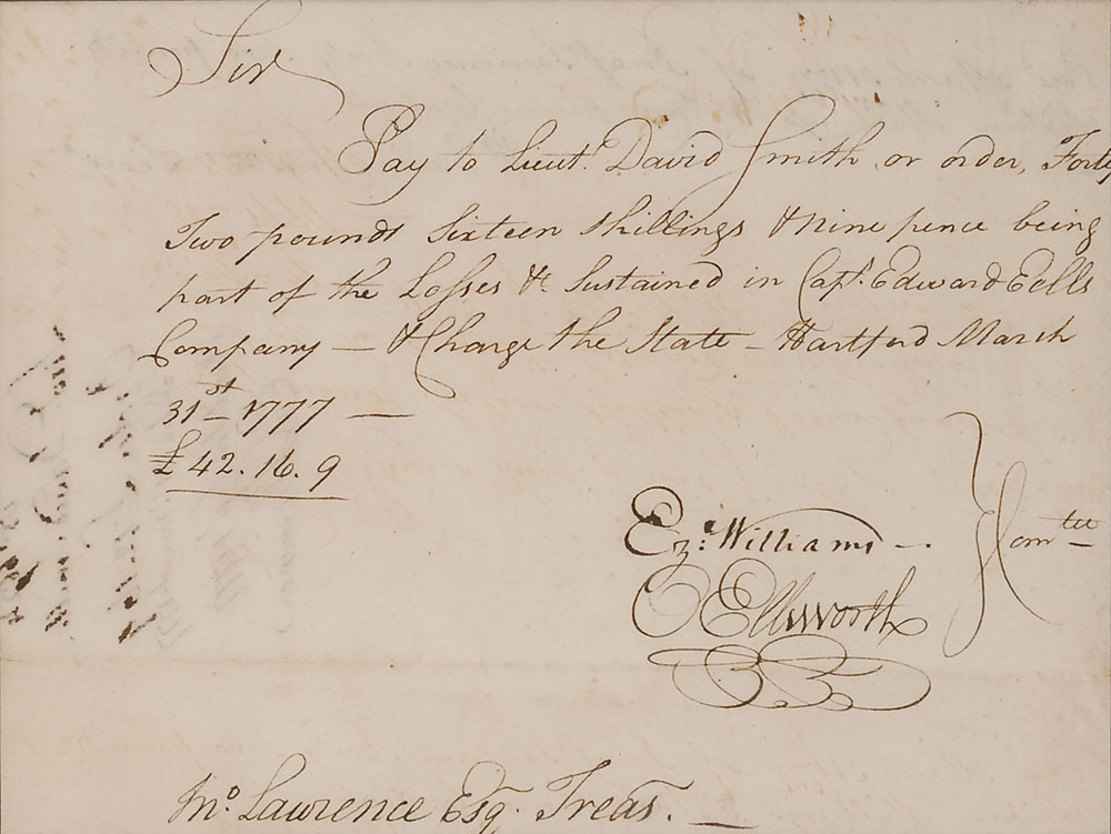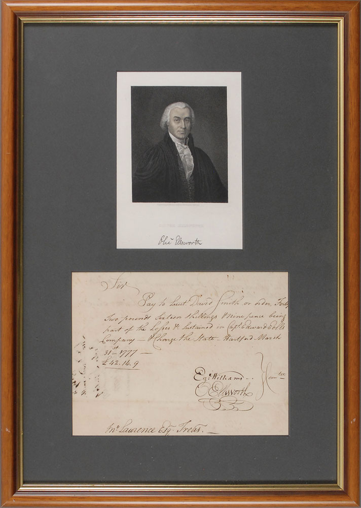 Third Chief Justice of the United States (1745–1807) and delegate to the Constitutional Congress who later submitted the amendments which became the Bill of Rights. Revolutionary War-dated manuscript DS, signed “O. Ellsworth,” one page, 7.75 x 6, March 31, 1777. Pay order for Lieutenant David Smith “being part of the losses he sustained in Capt. Edward Ells Company.” Signed at the conclusion by Ellsworth and one other committee member. Matted and framed with a portrait of Ellsworth to an overall size of 13 x 18.5. In fine condition, with intersecting folds and some show-through from writing on reverse. Pre-certified PSA/DNA and RR Auction COA.