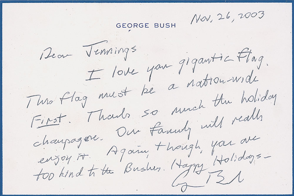 ALS, one page, 6.25 x 4, personal letterhead, November 26, 2003. Letter of thanks to Jennings Osbourne. In full: “I love your gigantic flag. This flag must be a nation-wide first. Thanks so much [for] the holiday champagne. Our family will really enjoy it. Again, though, you are too kind to the Bushes. Happy Holidays.” In very fine condition. Accompanied by the original mailing envelope. Pre-certified PSA/DNA and RR Auction COA.