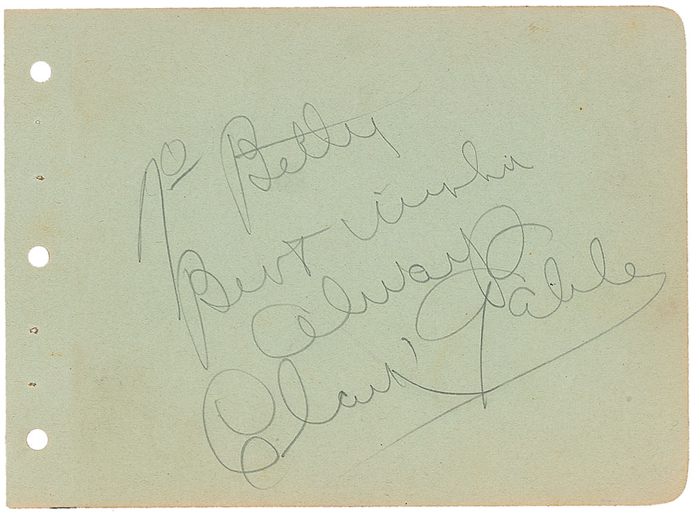 Vintage pencil signature and inscription, “To Betty, Best wishes always, Clark Gable,” on a light green 6 x 4.25 album page. In fine condition. Pre-certified PSA/DNA and RR Auction COA.