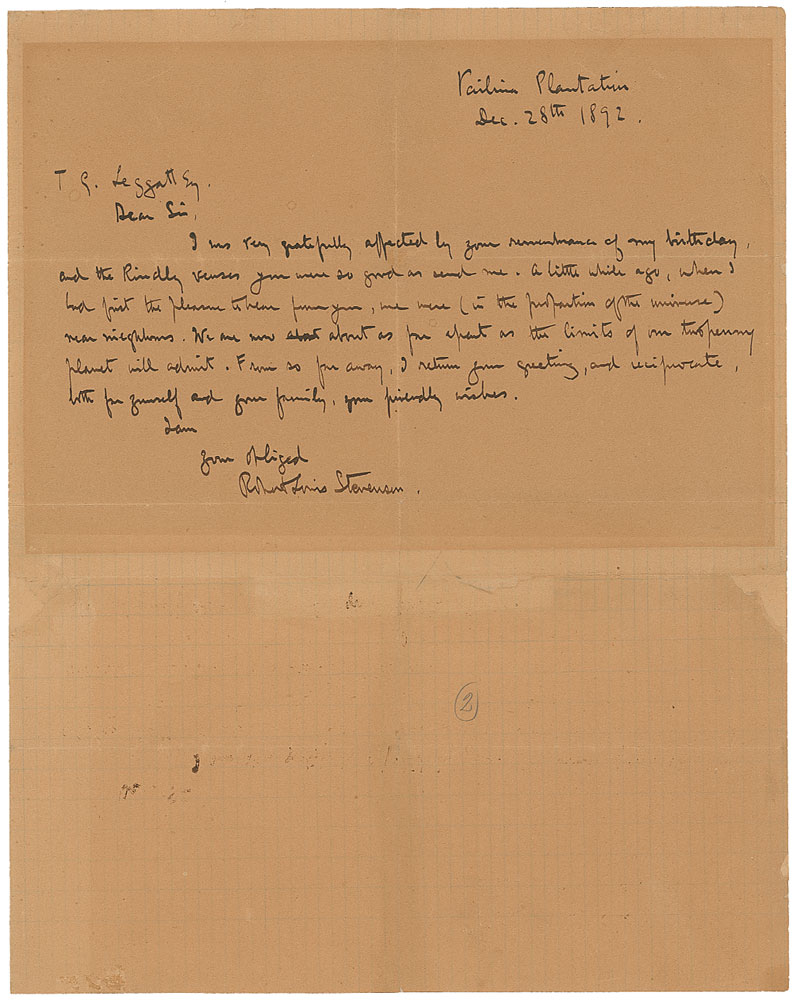 Scottish author (1850–1894) who takes a place among the most popular and durable literary figures of the nineteenth century. Uncommon ALS, one page, 9 x 11.25, Vailima Plantation, December 28, 1892. Letter to T. G. Leggatt. In full: “I was very gratefully affected by your remembrance of my birthday and the kindly verses you were so good to send me. A little while ago, when I had first the pleasure to hear from you, we were (in the proportion of the universe) near nieghbours [sic]. We are now about as far apart as the limits of our twopenny planet will admit. From so far away, I return your greeting, and reciprocate, both for yourself and your family, your friendly wishes.” A couple of small separations to intersecting folds (none through text or signature), a uniform toning from previous display, and a few small areas of repair and strengthening to folds on reverse, otherwise fine condition. A scarce and desirable literary autograph. Pre-certified PSA/DNA and RR Auction COA.