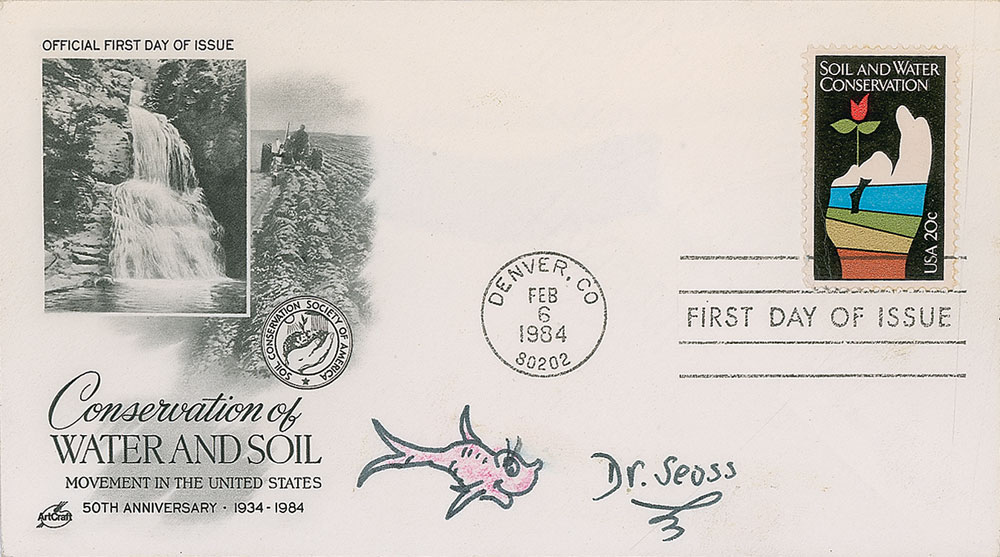 Original signed felt tip and colored pencil sketch of one red fish on a 6.5 x 3.5 First Day Cover with a cachet honoring the 50th anniversary of the conservation movement in the United States. In fine condition. Pre-certified PSA/DNA and RR Auction COA.