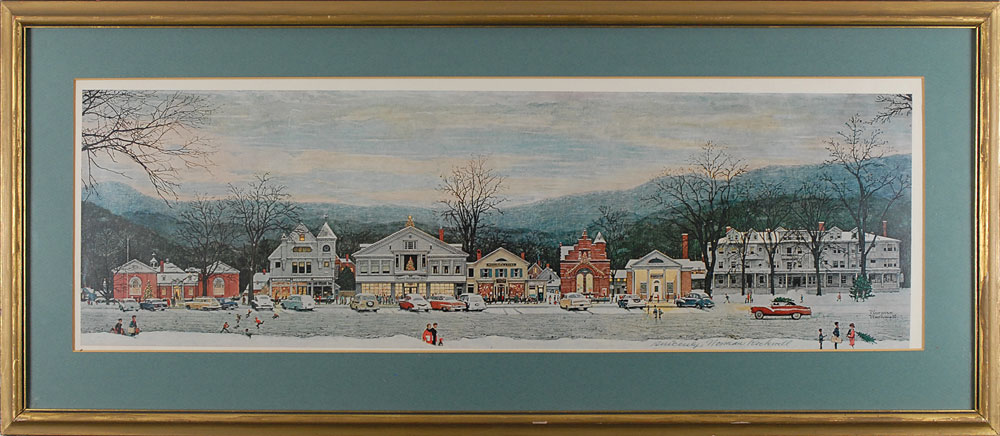 Color 29.25 x 9.5 print entitled ‘Stockbridge Main Street at Christmas,’ signed along the bottom in blue ballpoint, “sincerely, Norman Rockwell.” Matted and framed to an overall size of 34.75 x 15.5. In fine condition. Oversized. Pre-certified PSA/DNA and RR Auction COA.
