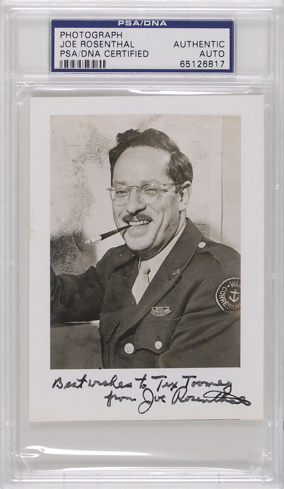 Photographer (1911–2006) best known for his famous shot of five Marines raising the flag on Iwo Jima. Glossy 3.25 x 4.75 photo, signed and inscribed in black felt tip, “Best wishes to Tex Toomey from Joe Rosenthal.” Encapsulated in a plastic PSA/DNA authentication holder. In fine condition. RR Auction COA.