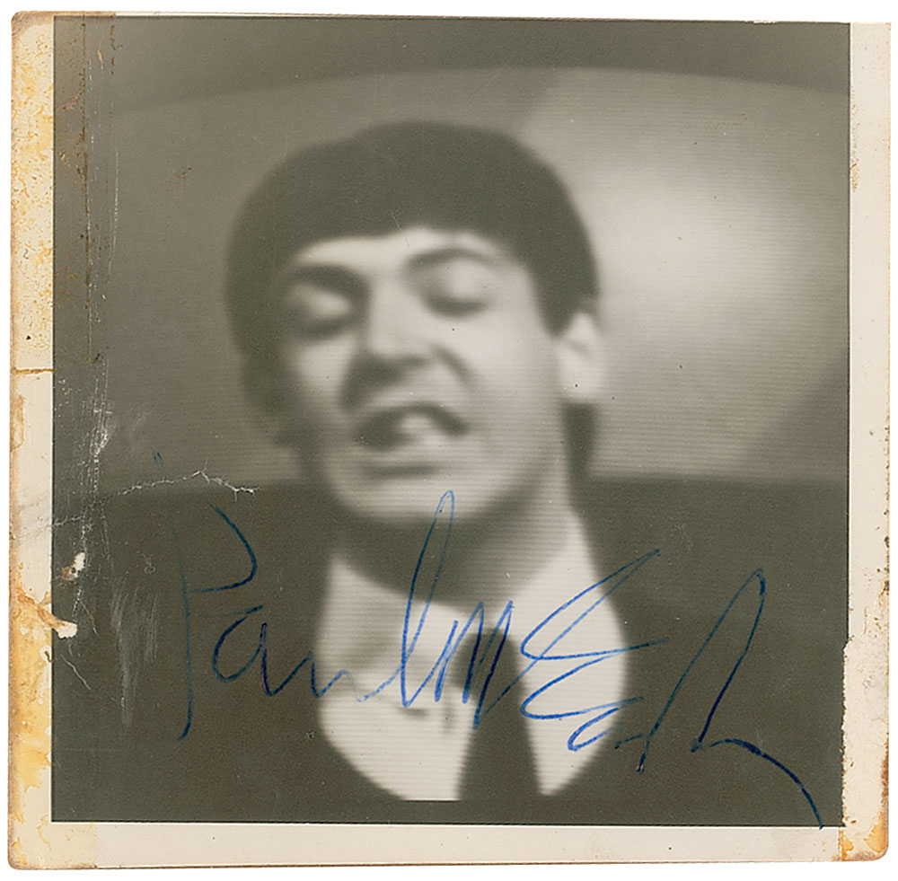 Vintage glossy 3.25 x 3.25 candid photo of McCartney on television performing with the Beatles, signed in blue ballpoint. Photo is affixed to an 8.5 x 6 scrapbook page, along with an unsigned glossy candid of George Harrison, presumably from the same performance. In very good condition, with trimmed top edge, tape toning to one vertical edge, with some surface loss to other vertical edge, and some slight toning from adhesive on reverse. Accompanied by a photocopy of a McCartney ALS, undated but written from his house at 20 Forthlin Road in Liverpool, to the scrapbook’s owner, which reads, in part: “I’ve heard that your photograph album was left at our house to be signed and you haven’t seen it for years or something. Well, at the moment, the house is chaos, but if you can wait a bit longer, I’ll have a thorough search, and when it turns up, I’ll give it to Di.” Now marked a historic site, McCartney’s childhood home at Forthlin Road is often referred to as the ‘birthplace of the Beatles,’ since it was there that they composed and rehearsed some of their earliest songs, including ‘She Loves You.’ An excellent pairing of unique and early images. Pre-certified Roger Epperson/REAL and RR Auction COA.