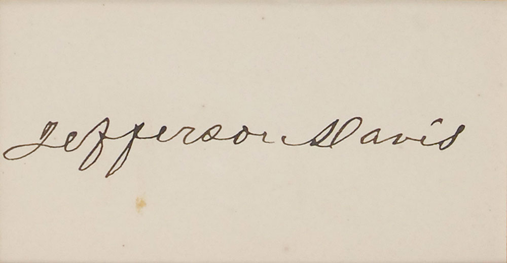 Nice ink signature, “Jefferson Davis,” on an off-white slip. Matted and framed with a carte-de-visite of Davis by C. D. Fredricks and Company to an overall size of 8 x 12.5. In fine condition. Pre-certified PSA/DNA and RR Auction COA.