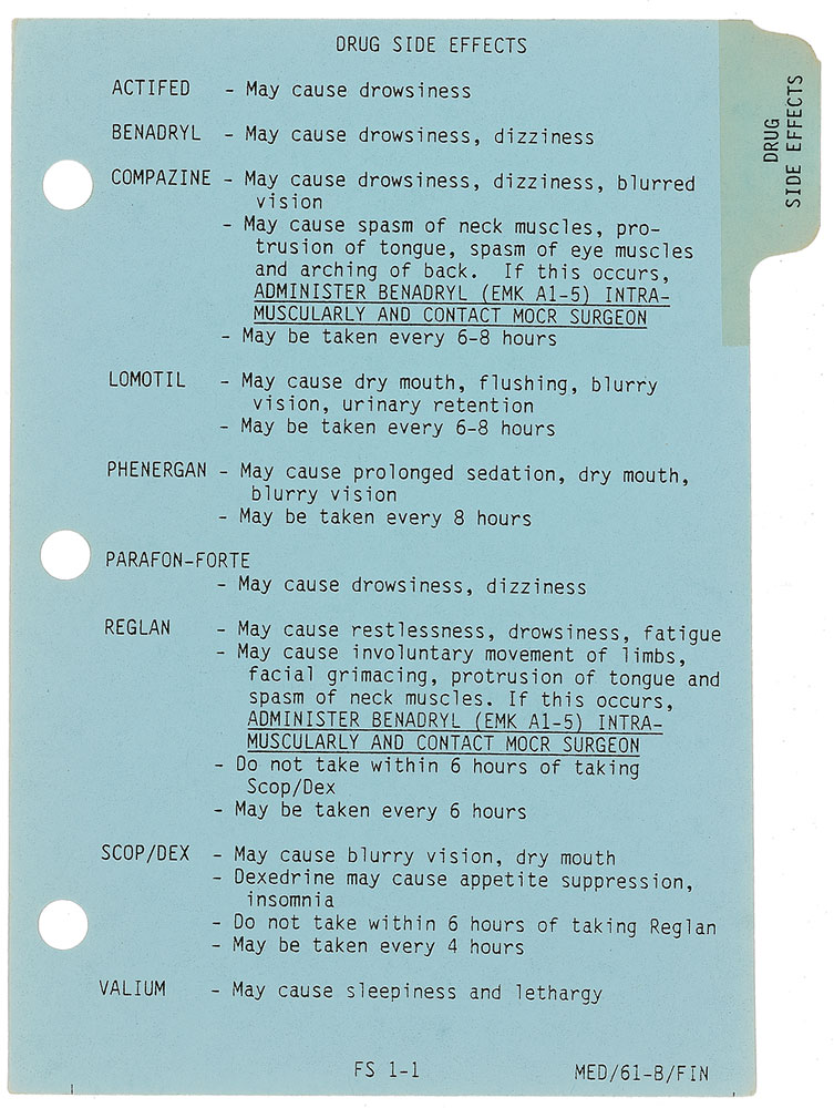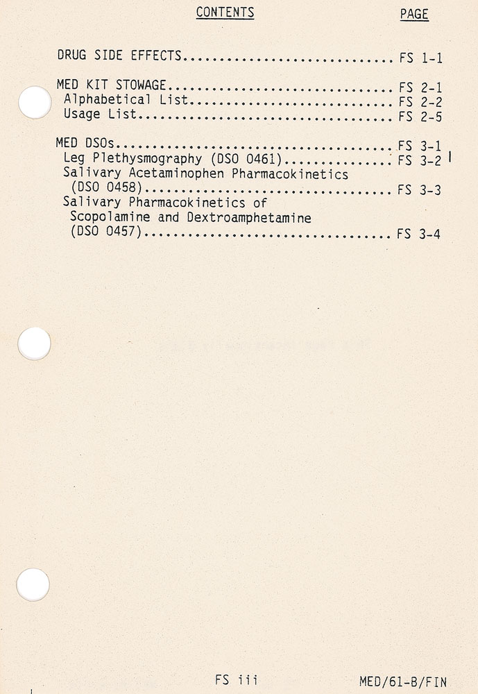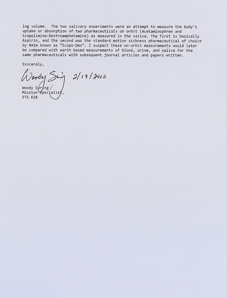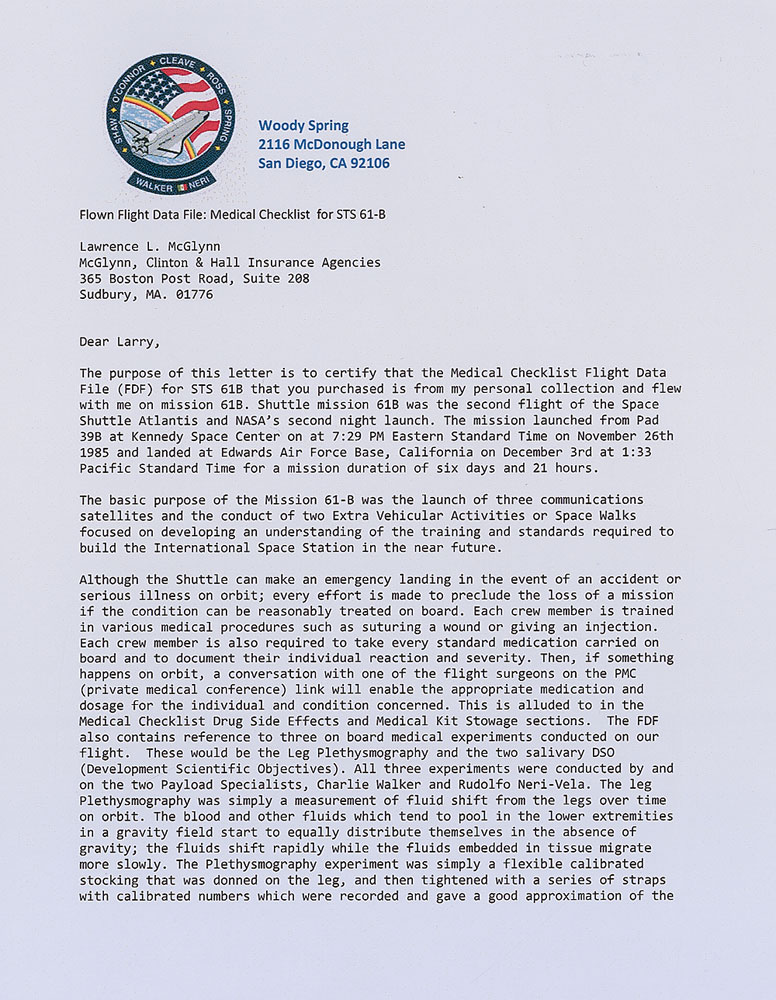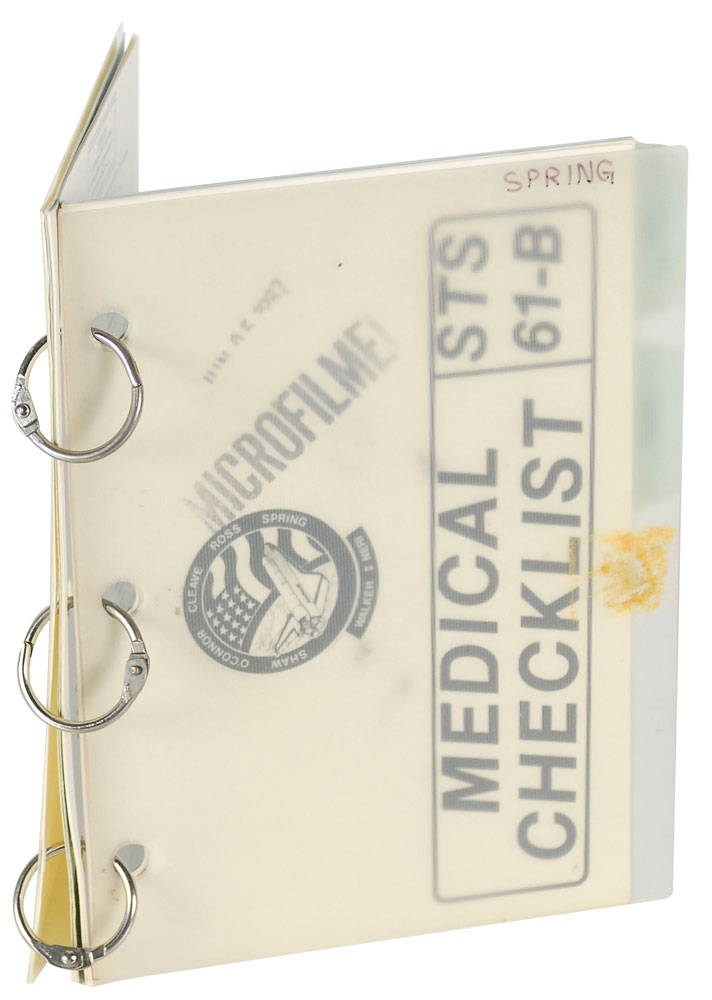 Flown medical checklist carried on board Shuttle Atlantis mission 61B in 1985. Checklist measures 5.5 x 8, is bound with its three original metal rings, and is 10 pages in length plus its two plastic covers. Cover bears a mission insignia and is labeled “Medical Checklist, STS 61-B,” and stamp-dated , “June 5, 1987 Microfilmed.” Three tabs are headed “Drug Side Effects,” “Stowage,” and “Med DSOs.” One page inside lists the side effects of all drugs carried on the shuttle, with several pages dedicated to stowage of the supplies, and also lists the procedures for two medical experiments which were performed during the mission: Leg Plethysmography and two Salivary Pharmacokinetics. Reverse of the back plastic cover retains one square of Velcro used to attach the checklist in the shuttle. Accompanied by a very detailed two page letter of provenance from astronaut Woody Spring, stating that this checklist originates from his personal collection, and explaining the medical training given the astronauts as well as the purposes of the included experiments. In fine condition. RR Auction COA.