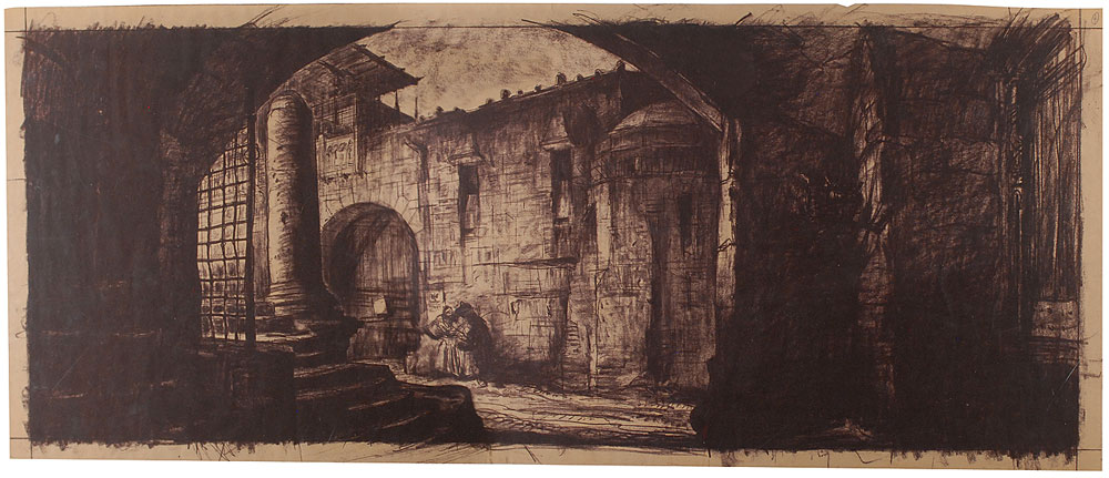 Original and quite large ‘brown line’ production sketch of a scene from Ben Hur, unsigned, 46.5 x 19, showing a dark and detailed image of a figure skulking outside of the Ben Hur family home. In fine condition. Rolled. RR Auction COA.