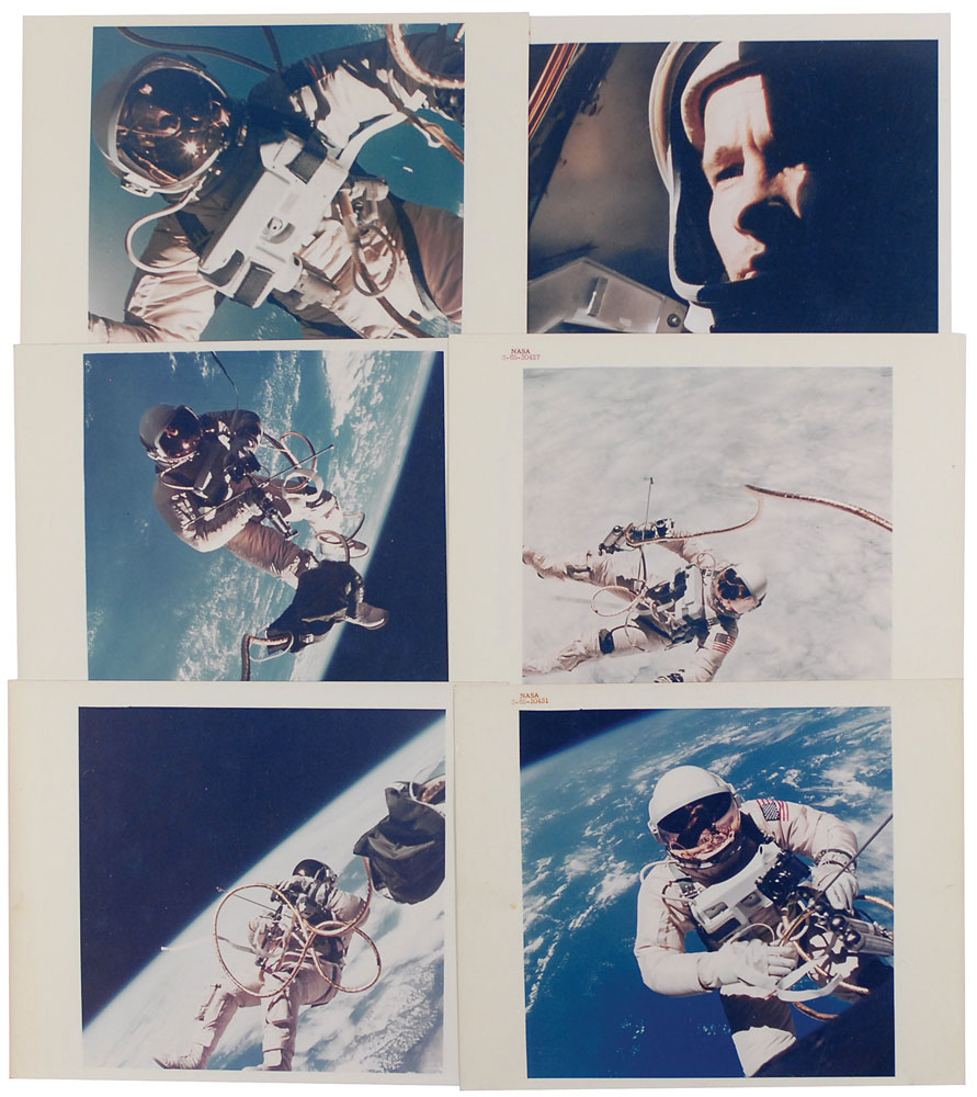 Six original color 10 x 8 NASA photos from the Gemini 4 mission, including five ‘red-numbered’ portraits, with five of the photos taken during White’s historic space walk. In fine condition. RR Auction COA.
