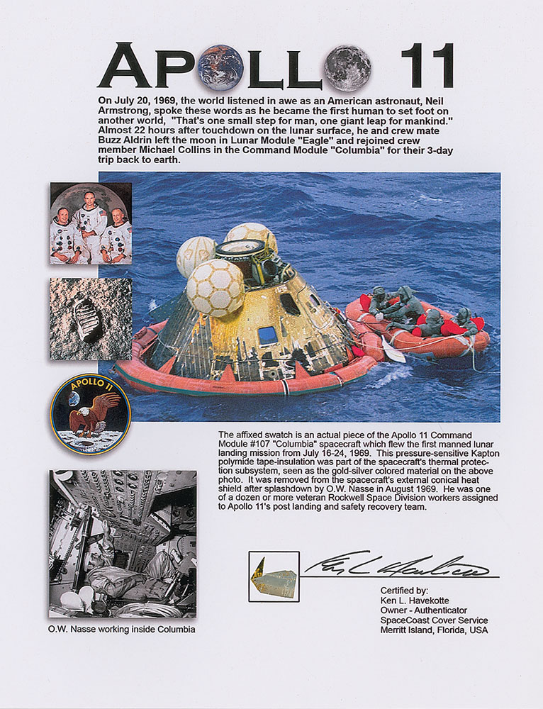 A .5 x .5 swatch of Kapton foil removed from the Apollo 11 Command Module Columbia’s thermal protection subsystem, removed after splashdown by O. W. Nasse, who was assigned to the Apollo 11 post landing and safety recovery team. Piece is affixed to an 8.5 x 11 informational letter of authenticity from Ken Havekotte. RR Auction COA.