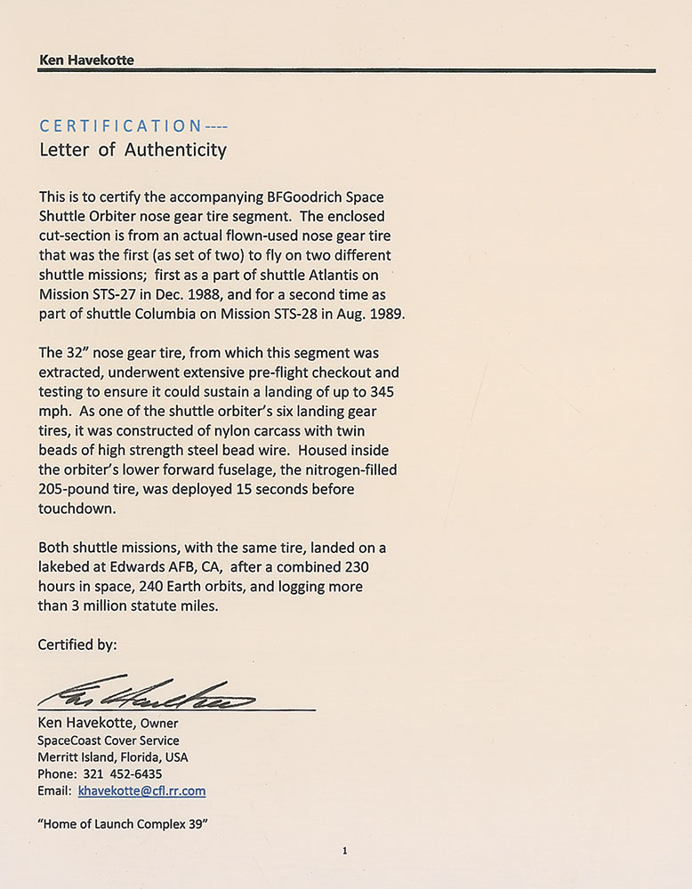 Two flown sections of the nose gear tire, flown on Atlantis mission STS-27 in 1988, and on Columbia mission STS-28 in August of 1989. One segment of the nylon and steel-bead wire tile measures 8.5″ across, with the smaller section measuring 2.25 x 2. Accompanied by a certificate of authenticity from Ken Havekotte, as well as printed information on shuttle nose gear tires and two images of the shuttles. In fine condition. RR Auction COA.