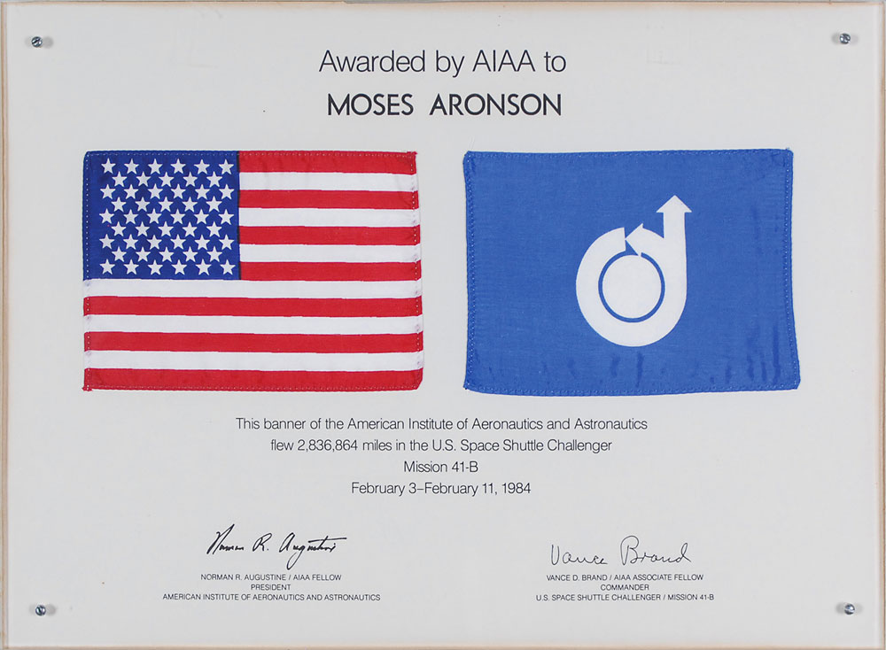 Two flown flags, a 5.5 x 4 printed fabric American flag, and an identical size flag of the American Institute of Aeronautics and Astronautics, carried on board the shuttle Challenger mission 41-B in February of 1984. Both flags are affixed to a 15 x 11 certificate presented to Moses Aronson by the AIAA, with printed signatures of the association’s president and mission commander Vance Brand at the bottom. Certificate is housed in a similar-size Lucite frame. In fine condition. RR Auction COA.