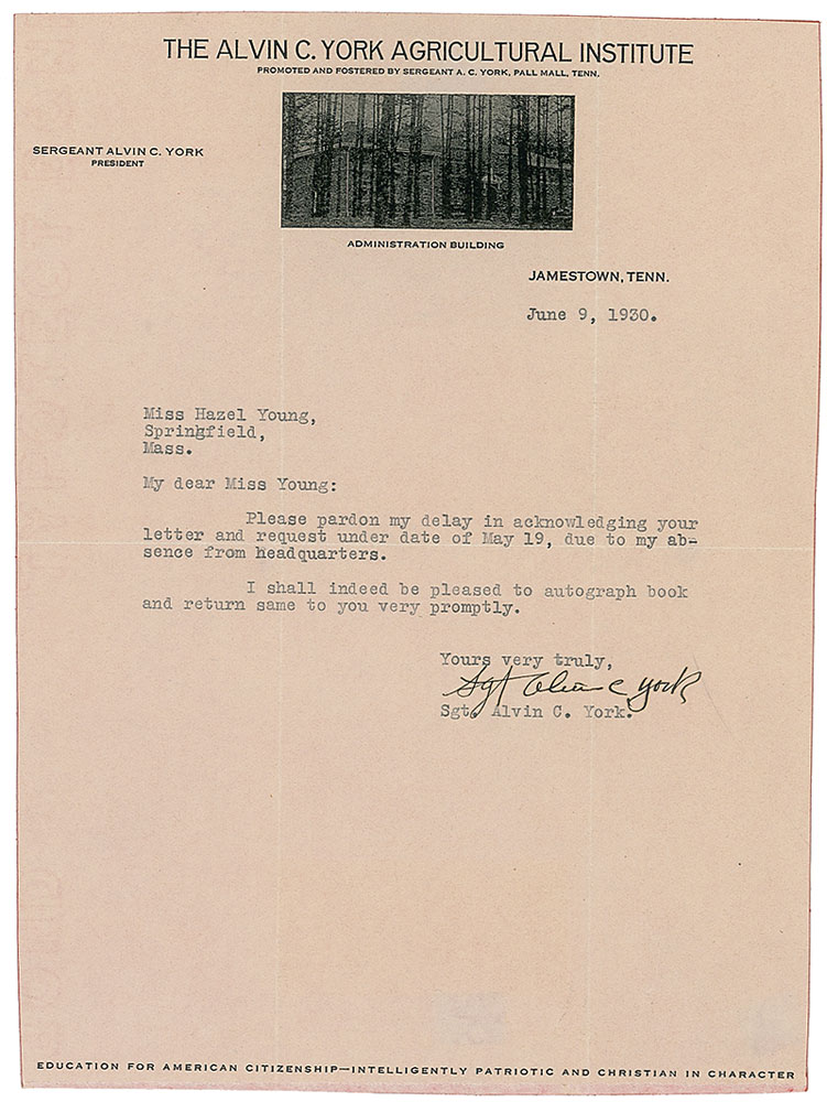 American World War I hero (1887–1964) who received the Medal of Honor for leading a successful charge on a German machine-gun nest that resulted in 28 German deaths and the capture of 132 prisoners. TLS, one page, 7.5 x 10, Alvin C. York Agricultural Institute letterhead, June 9, 1930. Short letter to an admirer. In full: “Please pardon my delay on acknowledging your letter and request under date of May 19, due to my absence from headquarters. I shall indeed be pleased to autograph book and return same to you very promptly.” Letter is affixed to an identical size sheet of cardstock. In fine condition, with intersecting folds, one through a single letter of signature, and trimmed edges. Pre-certified PSA/DNA and RR Auction COA.
