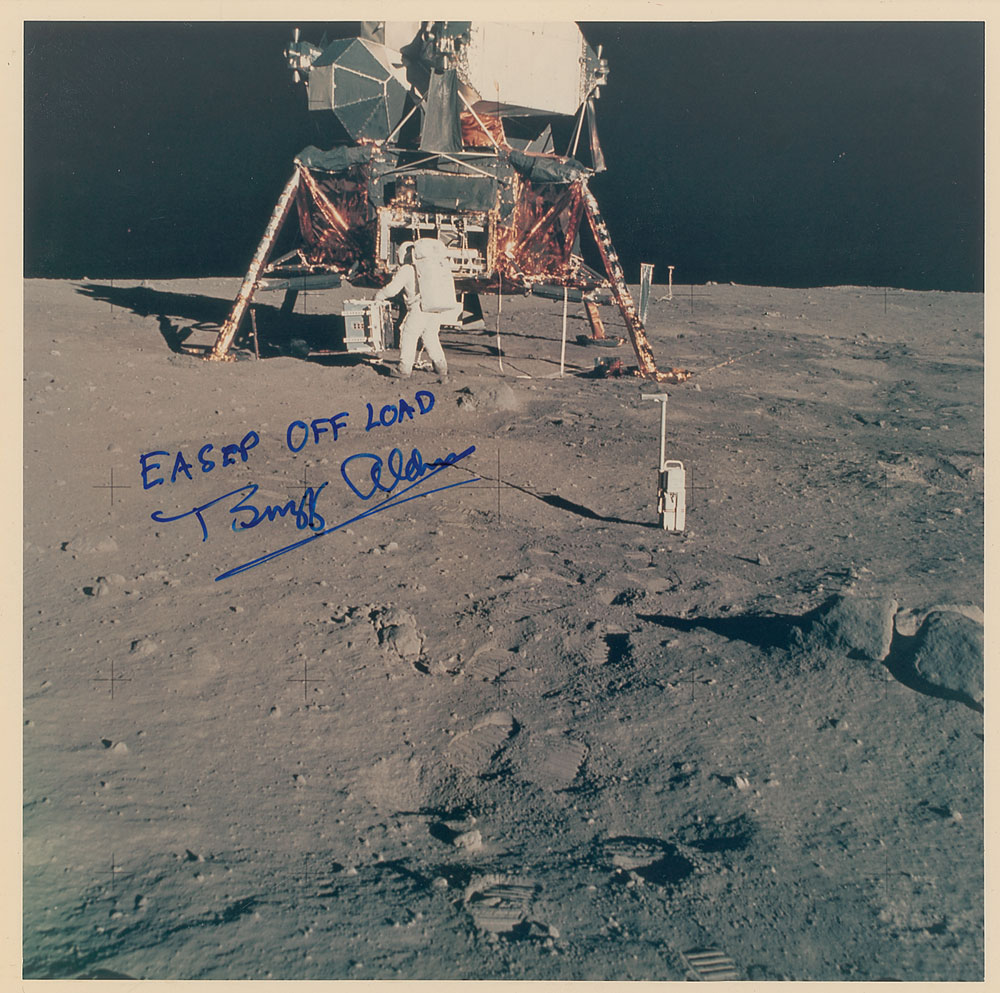 Color semi-glossy 8 x 8 photo of Aldrin working around the lunar module on the moon’s surface, signed in blue felt tip, “EASEP off load, Buzz Aldrin.” In fine condition. Pre-certified Steve Zarelli.