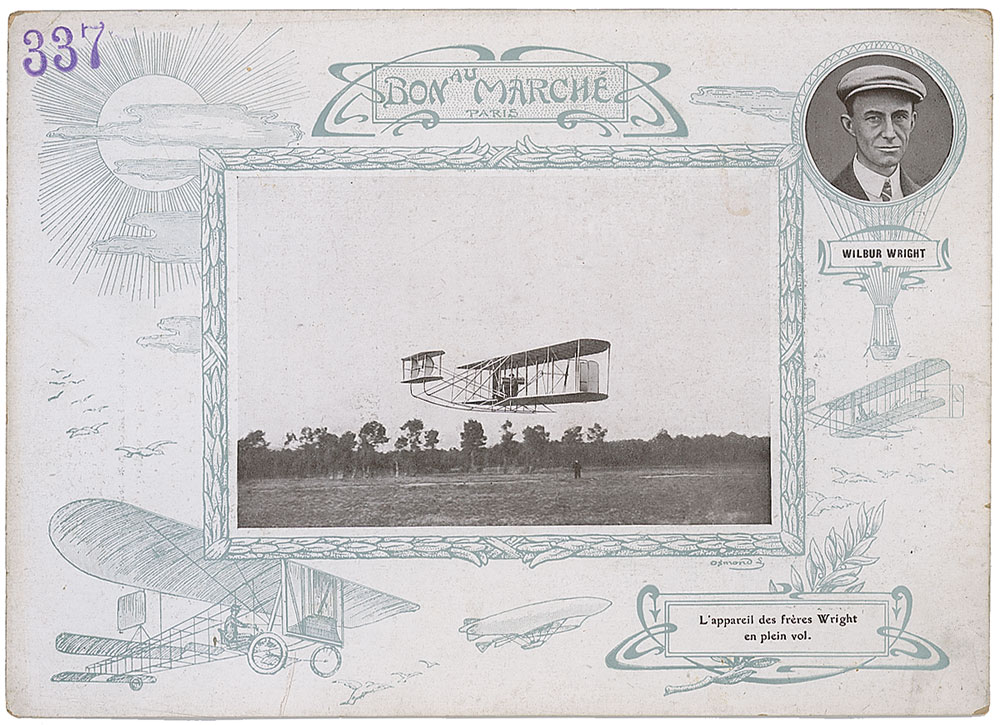 Original French advertisement broadside, 9.75 x 7, featuring an image of Wilbur Wright and the Wright Flyer on one side, headed across the top, “Bon au Marche Paris,” with printed information on the reverse, in French, with the front also stamped “337.” Scattered light soiling, a bit heavier to reverse, otherwise fine condition. RR Auction COA.