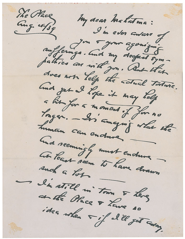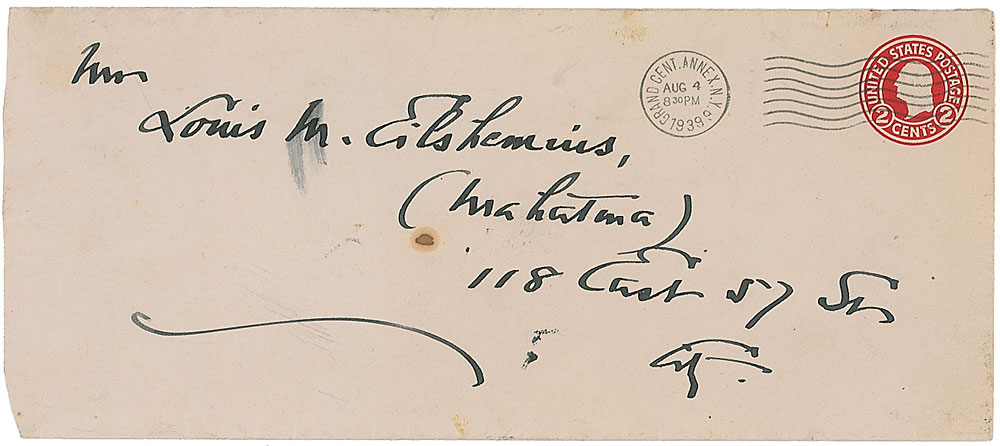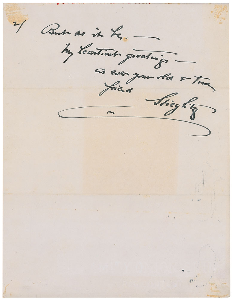 Important American photographer (1864–1946) who played an instrumental role in developing the craft as a legitimate art form. Very uncommon ALS signed “Stieglitz,” two onionskin pages, 8.5 x 11, August 4, 1939. Letter to painter Louis Eilshemius. In full: “I’m ever aware of you & your agonizing sufferings, and my deepest sympathies are with you. But it does not help the actual torture. And yet I hope it may help a bit for a moment if for no longer. It’s amazing what the human can endure—and seemingly must endure—at least seem to have drawn such a lot—I’m still in town & here at The Place & have no idea when & if I’ll get away—But so it be.” In fine condition, with small toned areas of adhesive remnants to corners. Accompanied by the original mailing envelope, addressed in Stieglitz’s hand. The Place was a gallery that Stieglitz opened in 1929, where he held exhibitions of artists such as Georgia O’Keeffe and Ansel Adams. Eilshemius was an eccentric painter who, after hostile criticism of his first solo exhibition in 1920, gave up painting all together, despite the support of the likes of Duchamp, Matisse, and Stieglitz. In 1931 he began to call himself ‘Mahatma’—just as this letter is addressed—and became increasingly reclusive until he passed away in 1941. Steiglitz is extremely scarce in any form—this is just the fifth item we have ever offered—and this association between artists makes it particularly desirable. RR Auction COA.