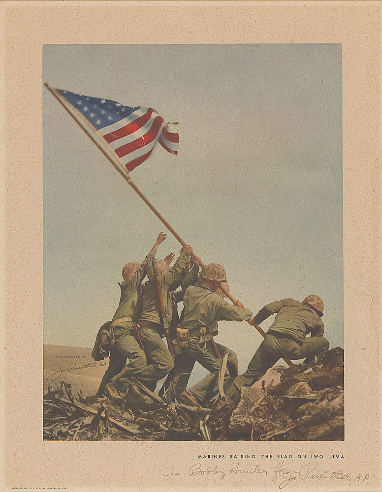 Color 11 x 14 print of a colorized image of Rosenthal’s iconic ‘Raising the Flag on Iwo Jima,’ signed and inscribed in the lower border in blue ballpoint (faded to black), “To Bobby Hunter, from Joe Rosenthal, A. P.” Uniform toning, unobtrusive dampstaining to right edge, and aforementioned discoloration to signature, otherwise fine condition. Pre-certified PSA/DNA and RR Auction COA.