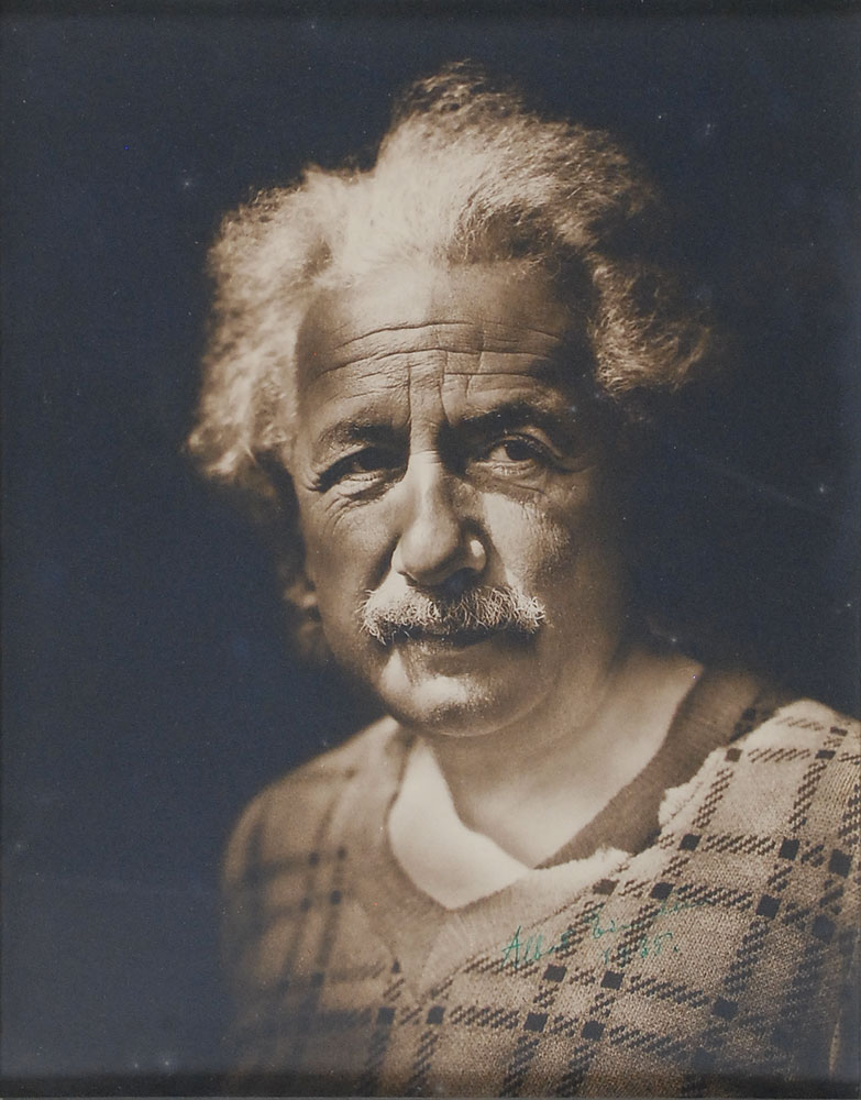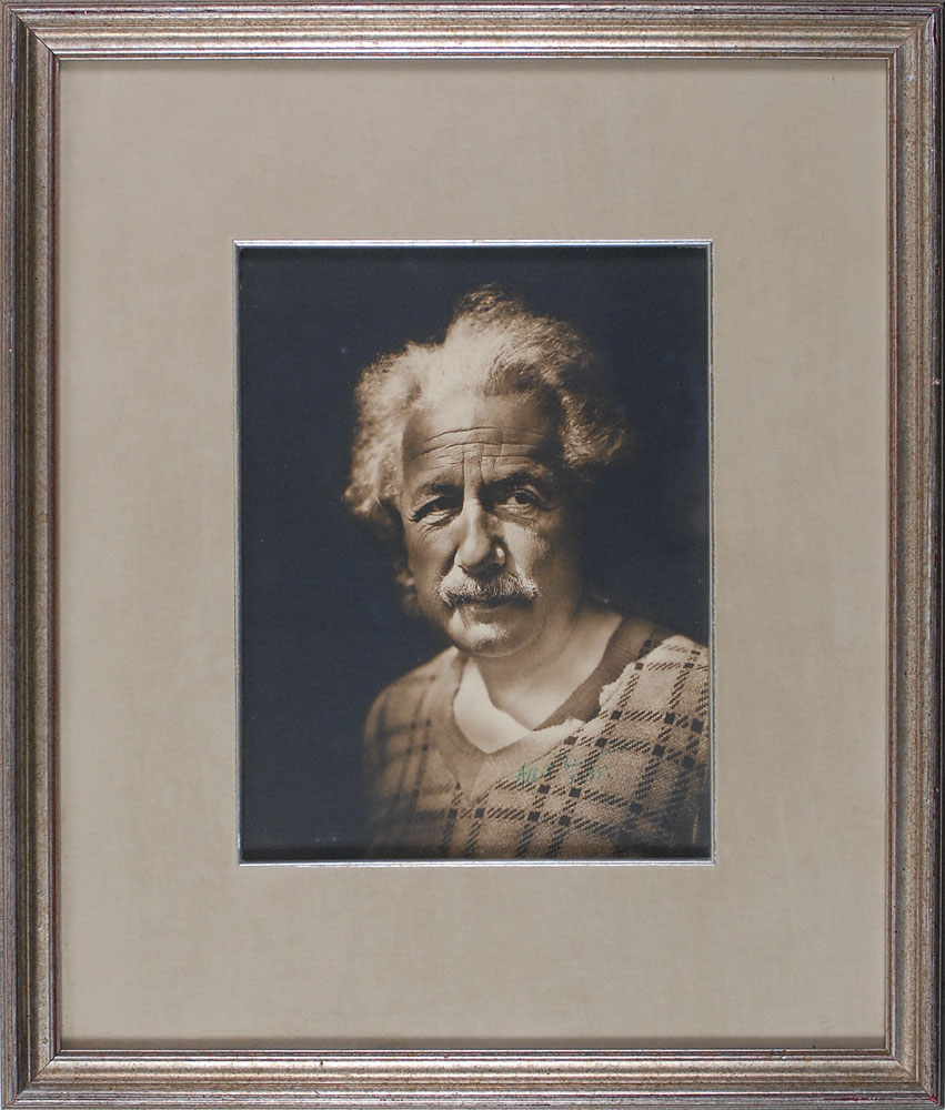 Superlative matte-finish 7.5 x 9.5 portrait of Einstein in a plaid sweater, signed in green ink, “Albert Einstein, 1935.” Attractively suede-matted and framed to an overall size of 15.5 x 17.5. In fine condition, with some light contrast to signature against the busy background. Einstein had recently emigrated to the United States when he signed this stunning photo—in 1933 he took up a position at the Institute for Advanced Study, and would become an American citizen in 1940. This is a positively magnificent portrait of the genius in his prime, certainly one of the finest images we have encountered. Pre-certified John Reznikoff/PSA/DNA and RR Auction COA.
