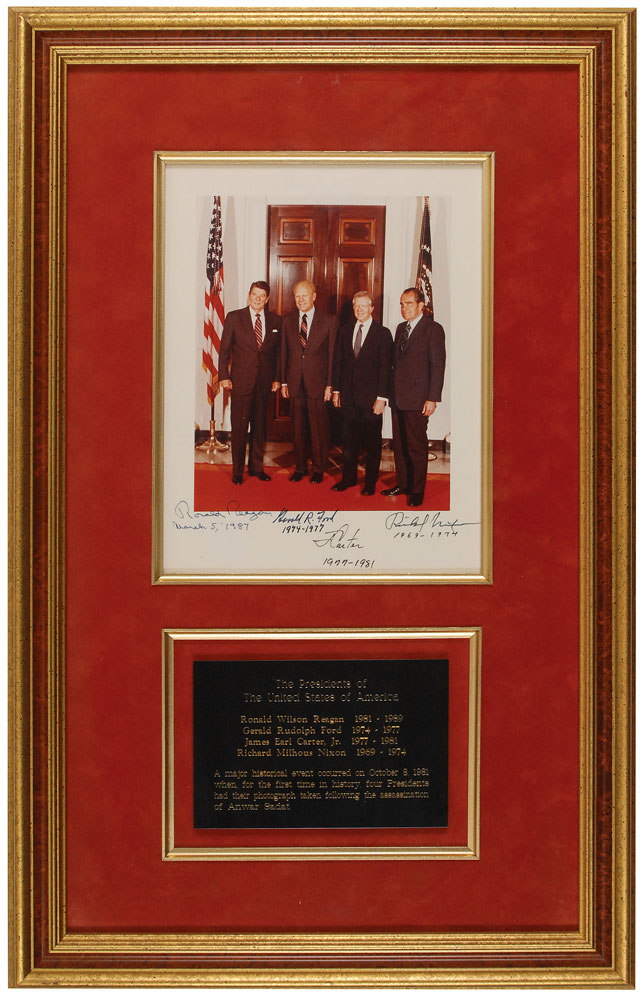 Exceptional color satin-finish 7.5 x 9.5 photo of Presidents Richard Nixon, Gerald Ford, Ronald Reagan, and Jimmy Carter gathered at the White House preparing to depart for Anwar Sadat’s funeral in 1981, signed in the lower border in black felt tip by all four, three adding the years of their presidency below, with Reagan notably writing the date he signed this remarkable format, during his presidency: “Richard Nixon, 1969–1974,” “Gerald R. Ford, 1974–1977,” “J. Carter, 1977–1981,” and “Ronald Reagan, March 5, 1987.” Gorgeously archivally suede-matted and framed with a descriptive plaque to an overall size of 15 x 23.5. In splendid condition. Accompanied by a listing compiled by the original collector, detailing the precise date that each signature was obtained. This is a positively remarkable photo in scarcity and historic importance—this is the most appealing example we have encountered, and the only one to which three presidents added the dates of their administration. Additionally, Reagan signed this photograph during a defining period of his time in office—the day prior, he had publicly addressed the nation for the first time regarding the Iran-Contra scandal, and on the day of signing spoke optimistically about a nuclear disarmament treaty between superpowers, anticipating the Intermediate-Range Nuclear Forces Treaty between the US and Soviet Union that would be signed later in 1987. An imposing autographed piece of historical significance.
