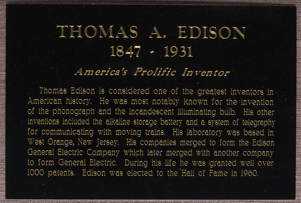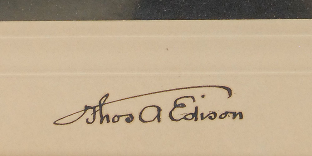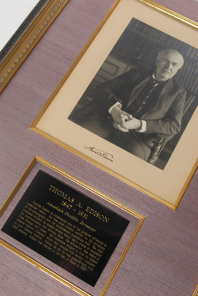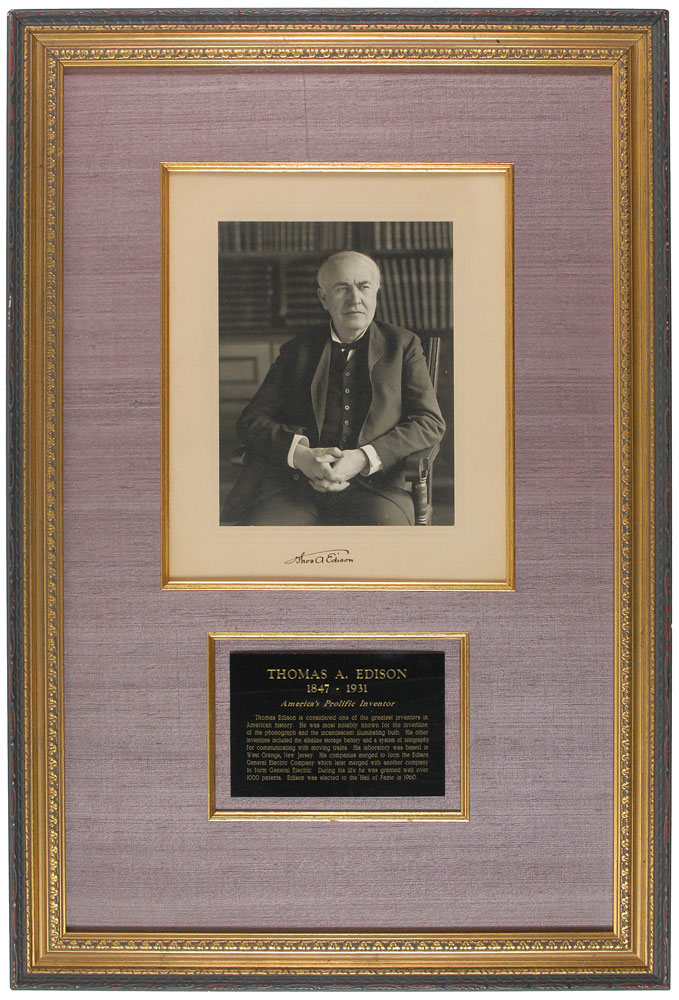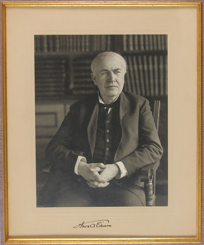 Remarkable matte-finish 6.5 x 8.5 portrait of Edison in a three-quarter-length pose seated in his study with his hands gently clasped in his lap, affixed to its original 9.25 x 11.25 mount, boldly signed on the mount in black ink with his instantly recognizable 'umbrella' signature, "Thos. A. Edison." Expertly archivally silk-matted and framed with a descriptive plaque to an overall size of 18 x 27. In fine to very fine condition. An oversized, crystal-clear photograph of the legendary 'Wizard of Menlo Park'—undoubtedly one of the finest extant.