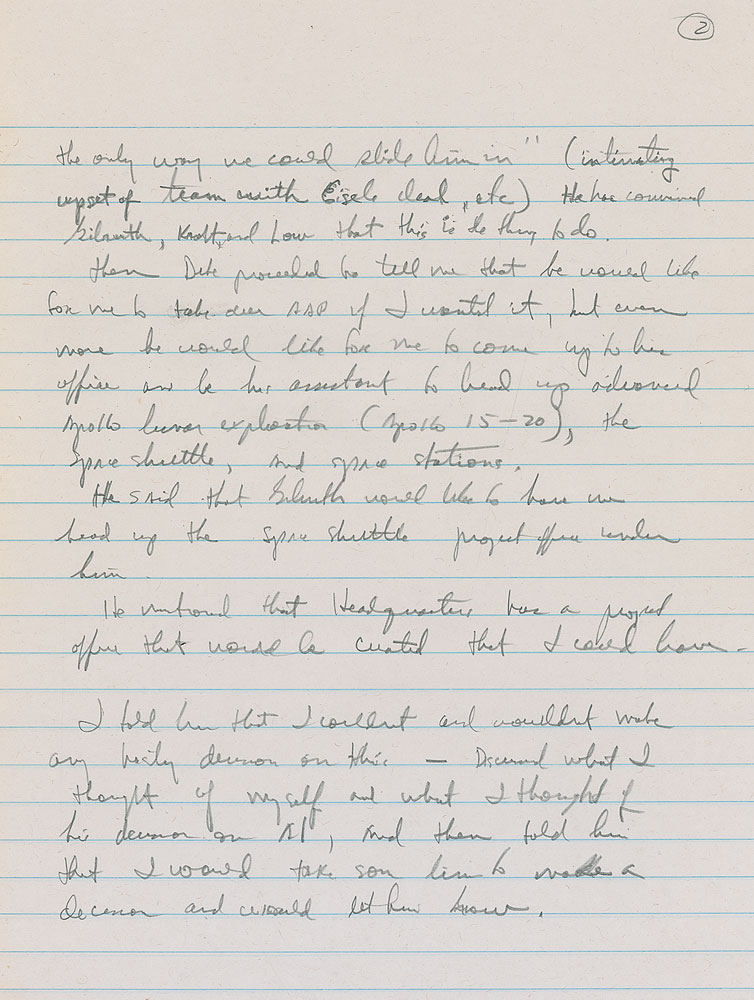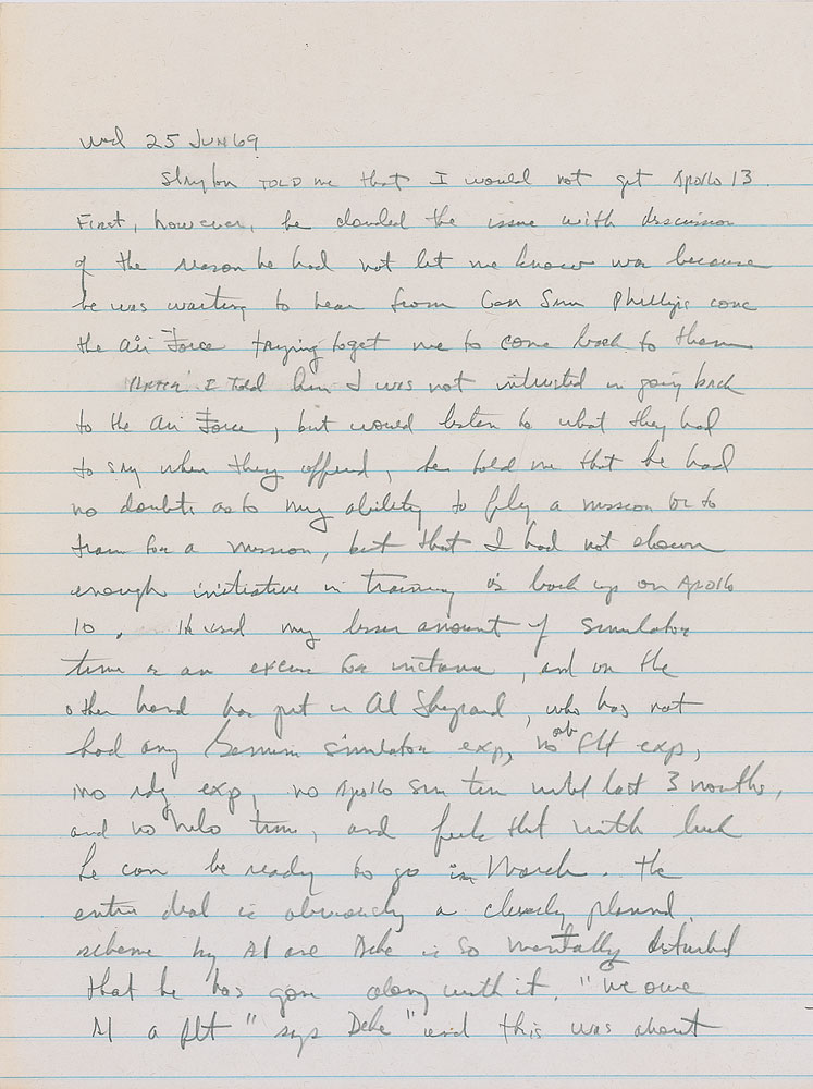 Handwritten notes by Cooper in pencil, unsigned, on two lightly-lined 8 x 10.5 sheets, dated June 25, 1969, describing how he was removed from consideration for an Apollo flight. In part: “Slayton told me that I would not get Apollo 13…He told me that he had no doubt in my ability to fly a mission or to train for a mission, but that I had not shown enough initiative in training in back up on Apollo 10. He used my lesser amount of simulator time as an excuse…and on the other hand he put in Al Shepard, who has not had any Gemini simulator exp, no flt exp, no rdg exp, no Apollo sim time until last 3 months, and no helo time, and feels that with luck he can be ready to go in March. The entire deal is obviously a cleverly planned scheme by Al and Deke is so mentally disturbed that he has gone along with it. ‘We owe Al a flt’ says Deke and this was about the only way we could slide him in…Then Deke proceeded to tell me that he would like for me to take over AAP if I wanted it…and be his assistant to head up advanced Apollo lunar exploration (Apollo 15-20), the Space Shuttle, and space stations.” In fine condition. Cooper was selected as the Apollo 10 back-up commander, and originally assigned to command the Apollo 13 mission. After this falling out with NASA management, Cooper retired from NASA in July of 1970, claiming that Shepard and Slayton were manipulating crew assignments in order to improve their own chances of grabbing a hotly contested assignment. Pre-certified Steve Zarelli.