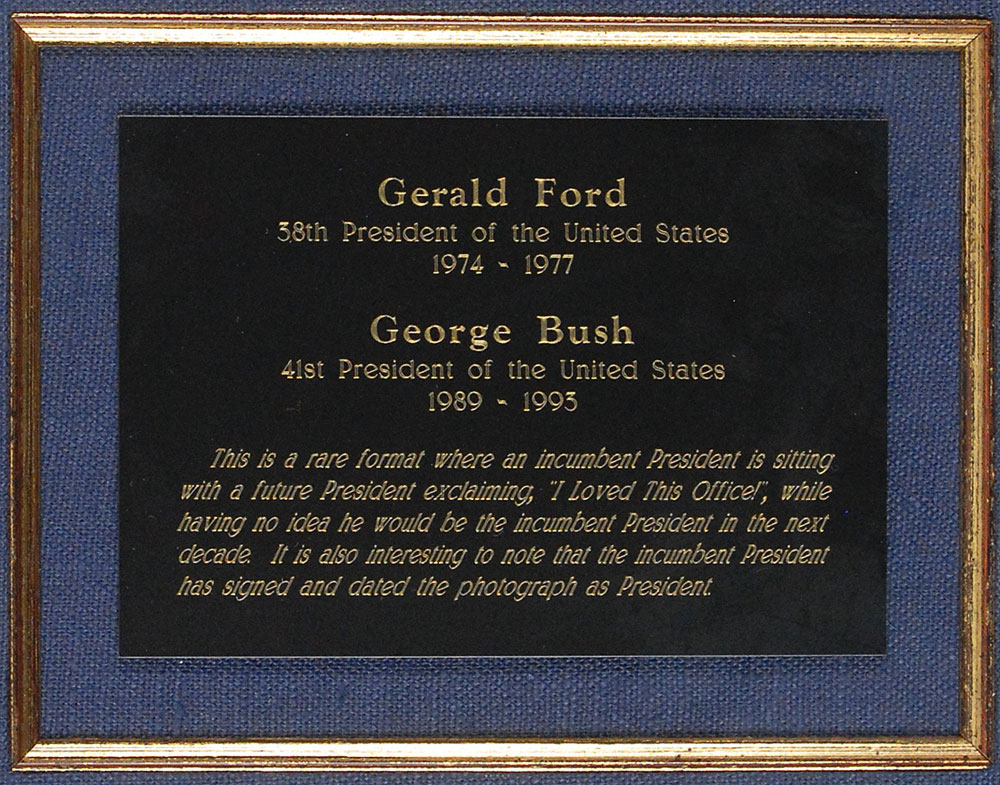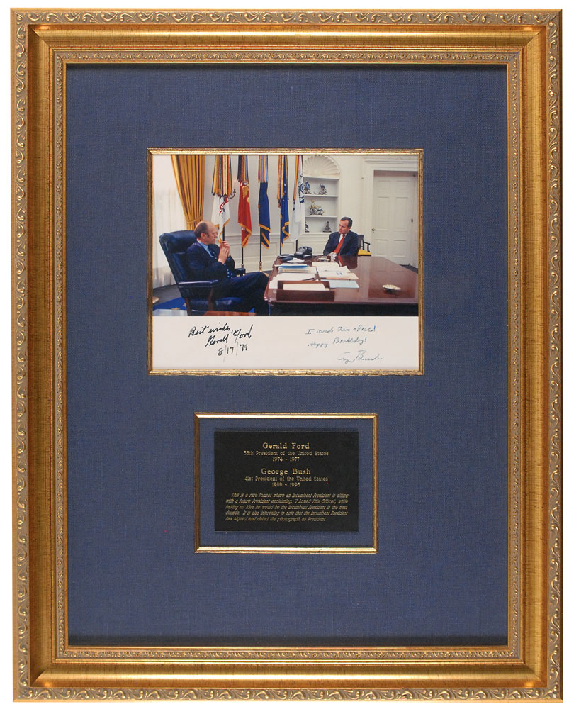 Color glossy 9 x 7.5 photo of President Ford meeting with future president George Bush in the Oval Office, signed in the lower border in black felt tip, “Best wishes, Gerald Ford, 8/17/74” and “I loved this office! Happy birthday! George Bush.” Gorgeously archivally cloth-matted and framed with a descriptive plaque to an overall size of 19 x 24. In excellent condition. At the time, Bush was unaware that the office he loved would soon be his own. A historical forecasting and most unusual example.