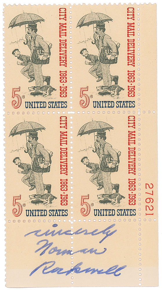 Block of four five-cent stamps designed by Rockwell to honor city mail delivery, 2.25 x 4, signed in the lower border in fountain pen, “Sincerely, Norman Rockwell.” In fine condition, with light overall toning. Pre-certified PSA/DNA and RR Auction COA.
